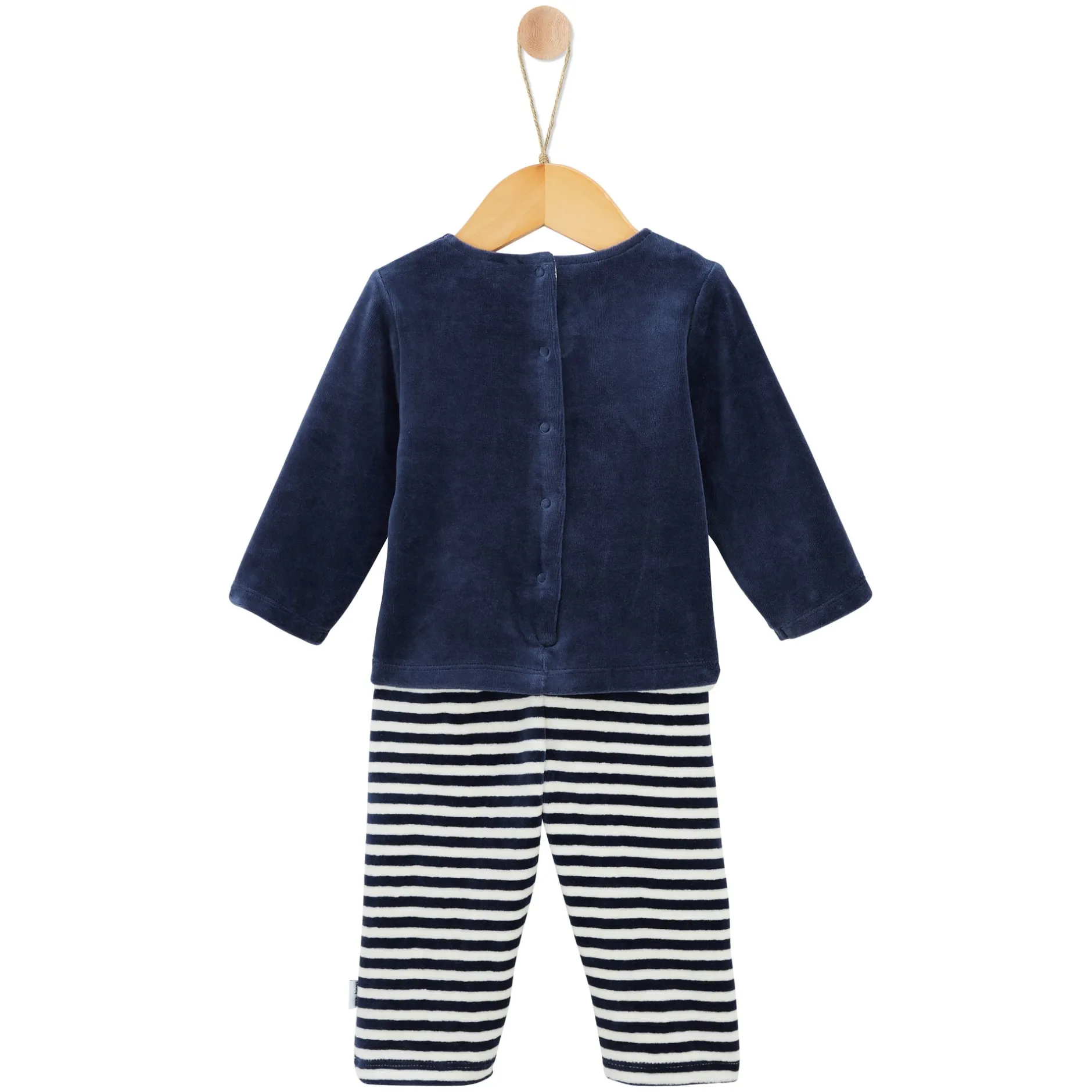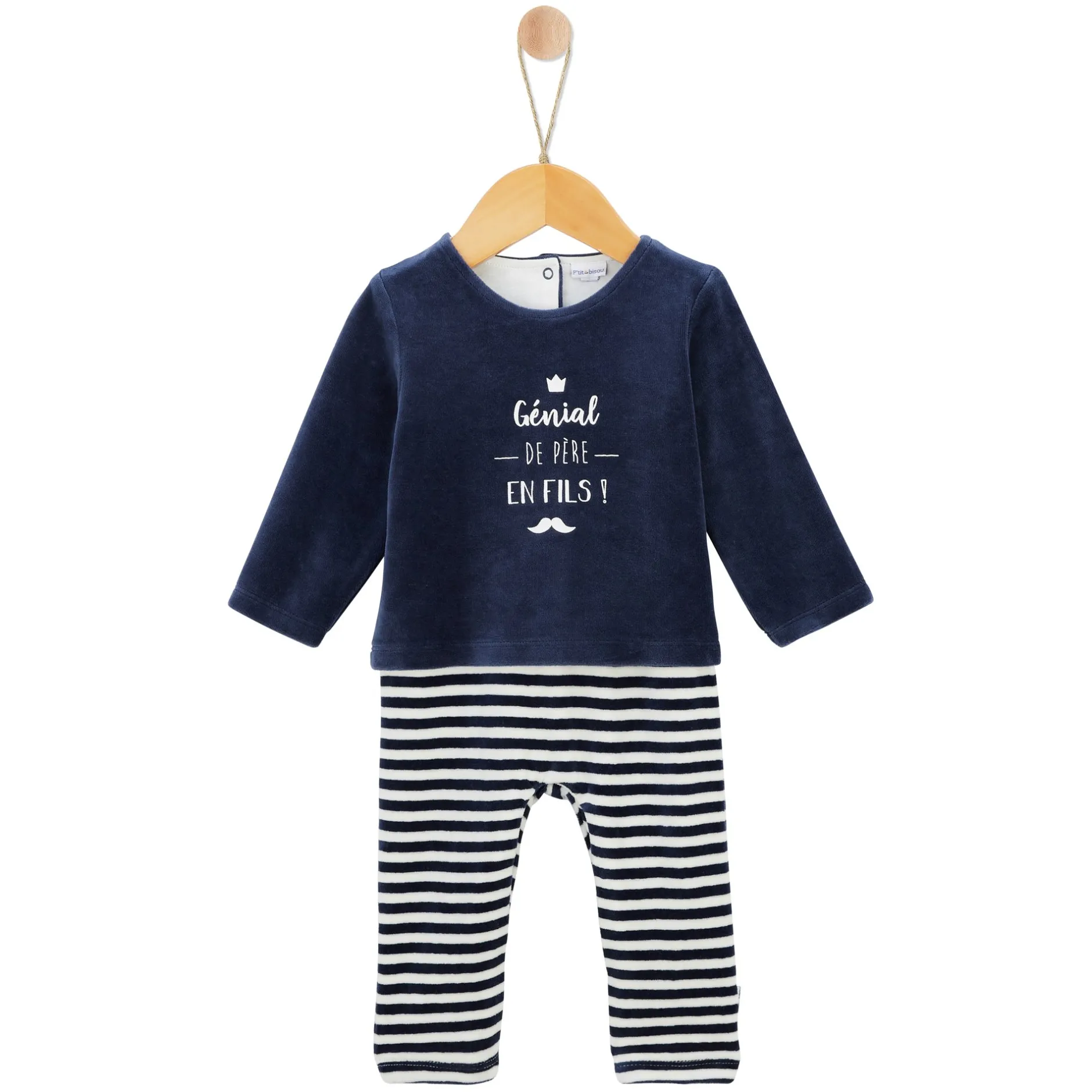 Combinaison sans pieds P’tit Bisou en velours tout doux : 1 haut en velours marine avec texte « génial de père en fils » qui donne un côté très mode et le bas attenant est en rayure blanc/marine en velours.