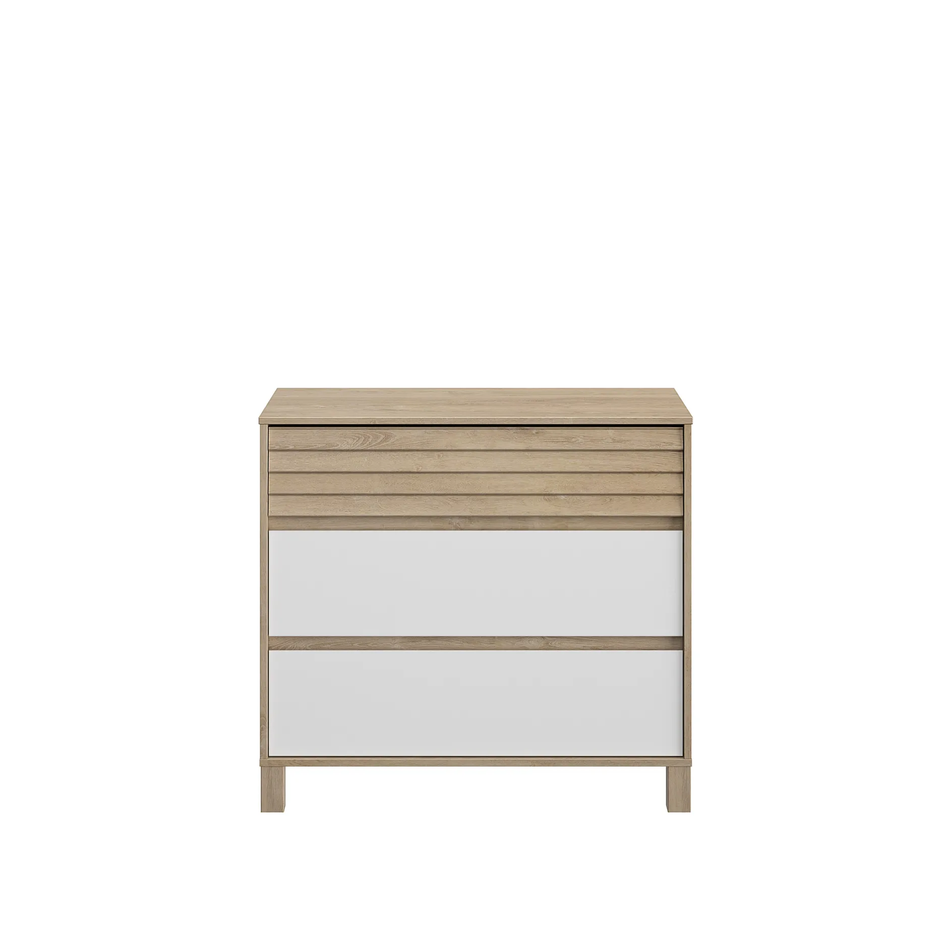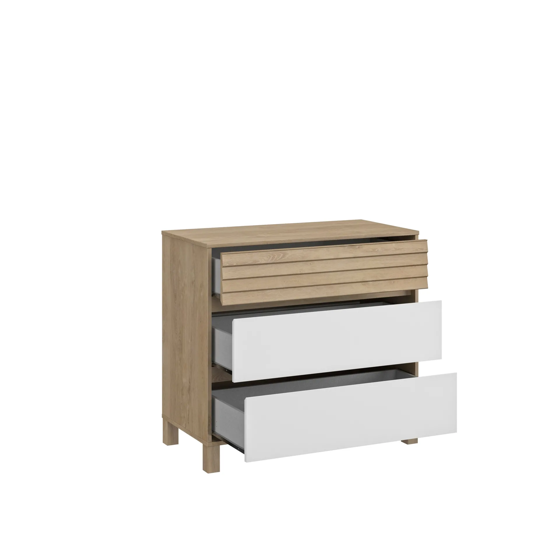 La commode de la collection Achille a été dessinée dans un style moderne et épuré, grâce à ses finitions chêne blond et blanc.
