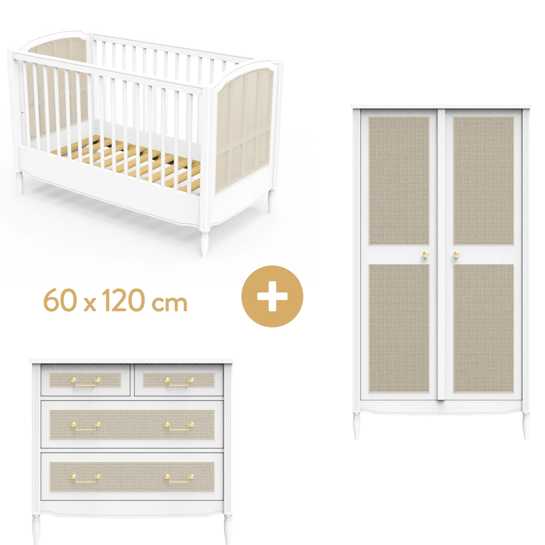 Ce trio chambre Hermione de la marque Théo composé d’un lit 60×120 cm, d’une armoire et d’une commode.