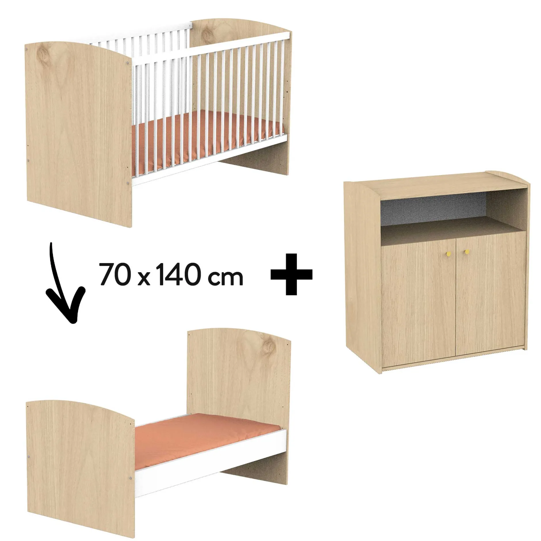 Ce pack contient un lit 70 x 140 cm évolutif et une commode (coloris au choix) de la collection Alice de Sauthon.