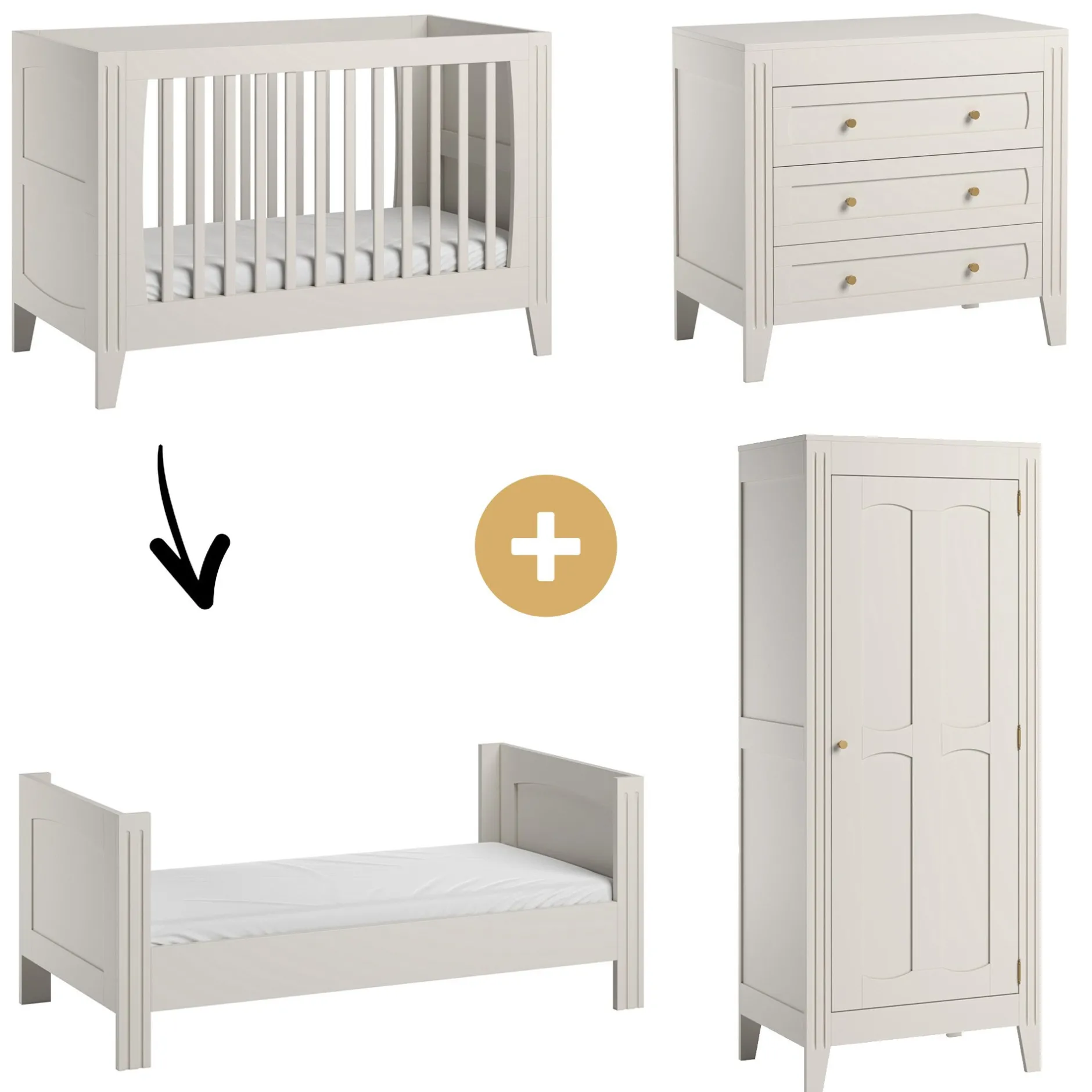 Trio chambre Milenne de la marque Vox composé d’un lit 70×140 cm d’une armoire et d’une commode.