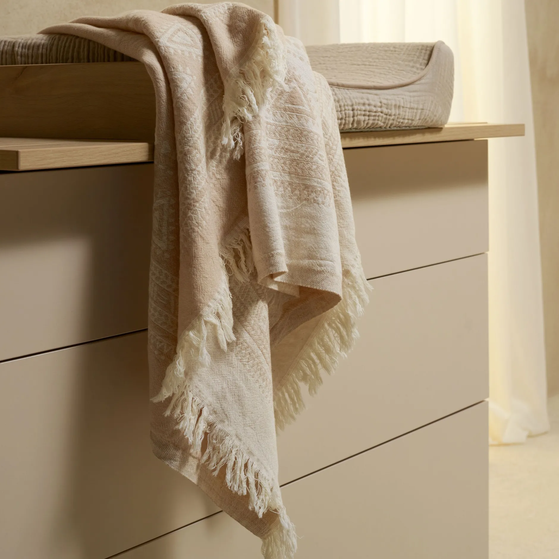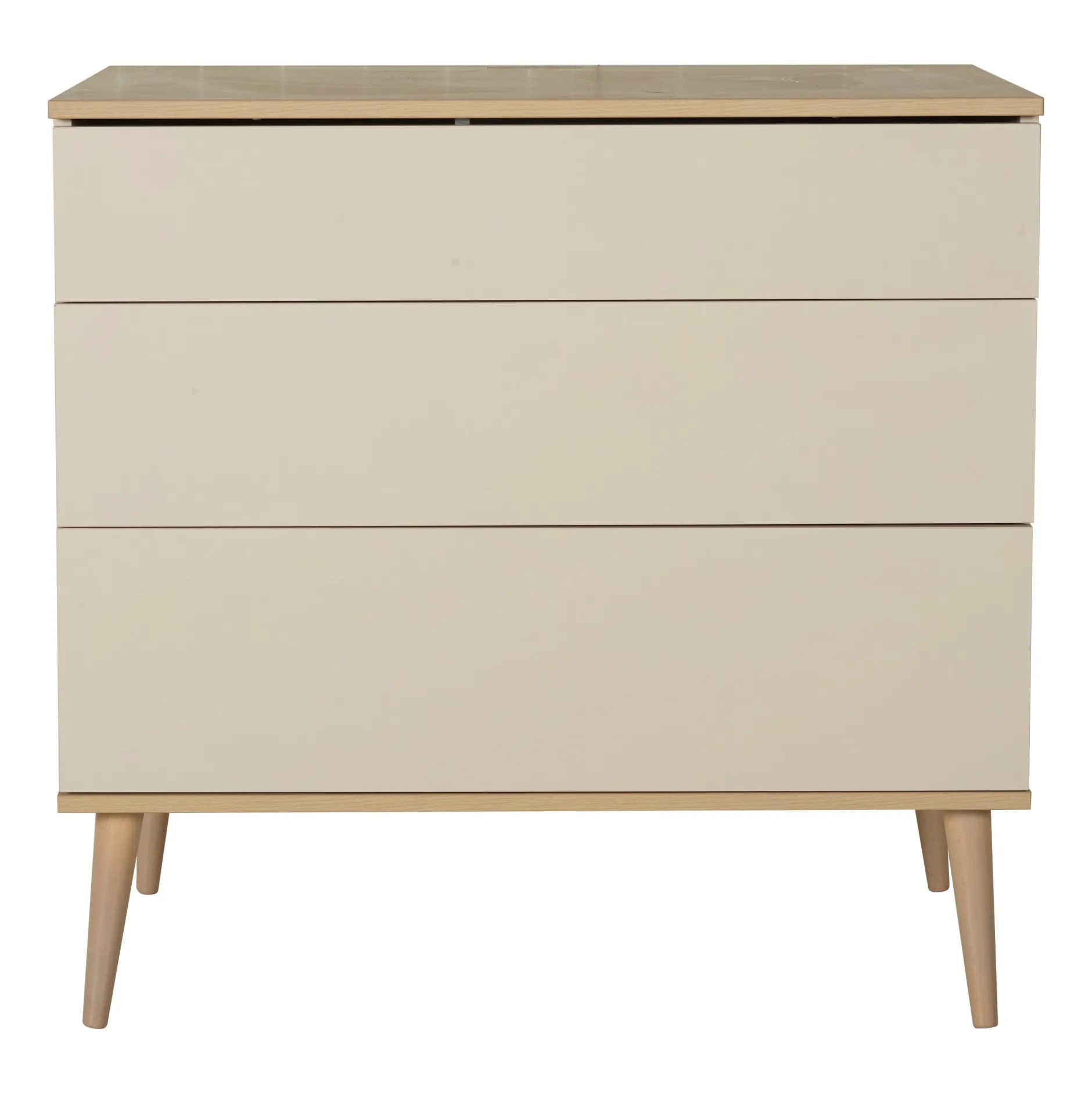 Commode 3 tiroirs de la chambre Flow de Quax. Plan à langer vendu séparément. Superstructure du meuble en panneau de particules mélaminé. Le plateau et le fond des commodes est en panneau avec bois imprimé, tandis que les côtés et les façades des tiroirs sont de couleur unie.