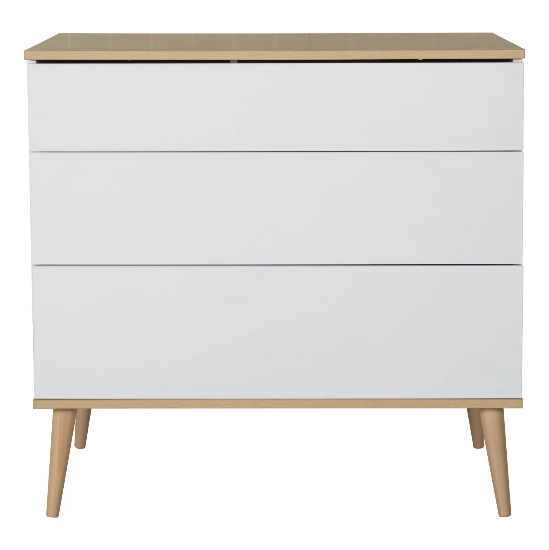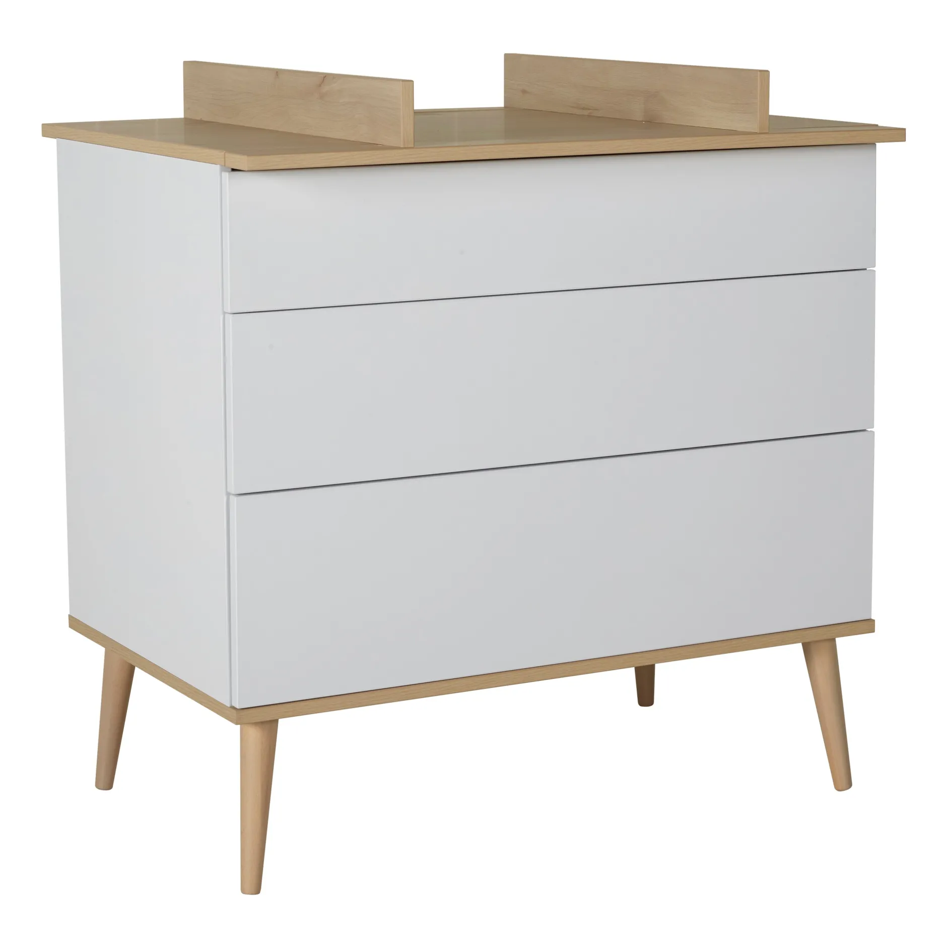 Commode 3 tiroirs de la chambre Flow de Quax. Plan à langer vendu séparément. Superstructure du meuble en panneau de particules mélaminé. Le plateau et le fond des commodes est en panneau avec bois imprimé, tandis que les côtés et les façades des tiroirs sont de couleur unie.