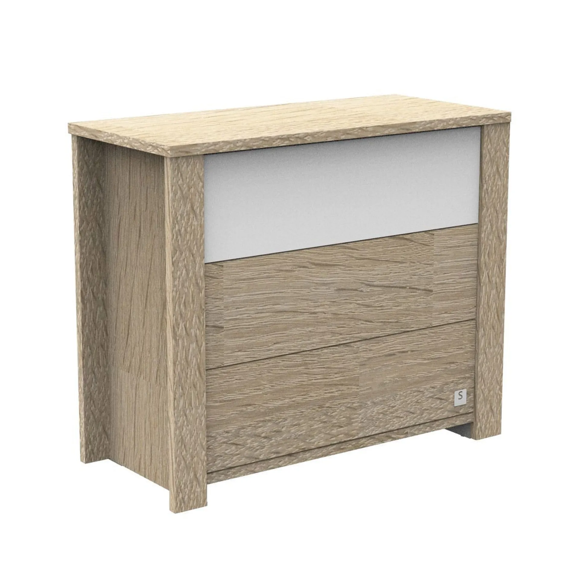 - Dessus, traverse basse avant, montants avants et arrières, côtés et faces de tiroirs en panneaux de particules revêtus papier décor Chêne noisette, chants décor bois.