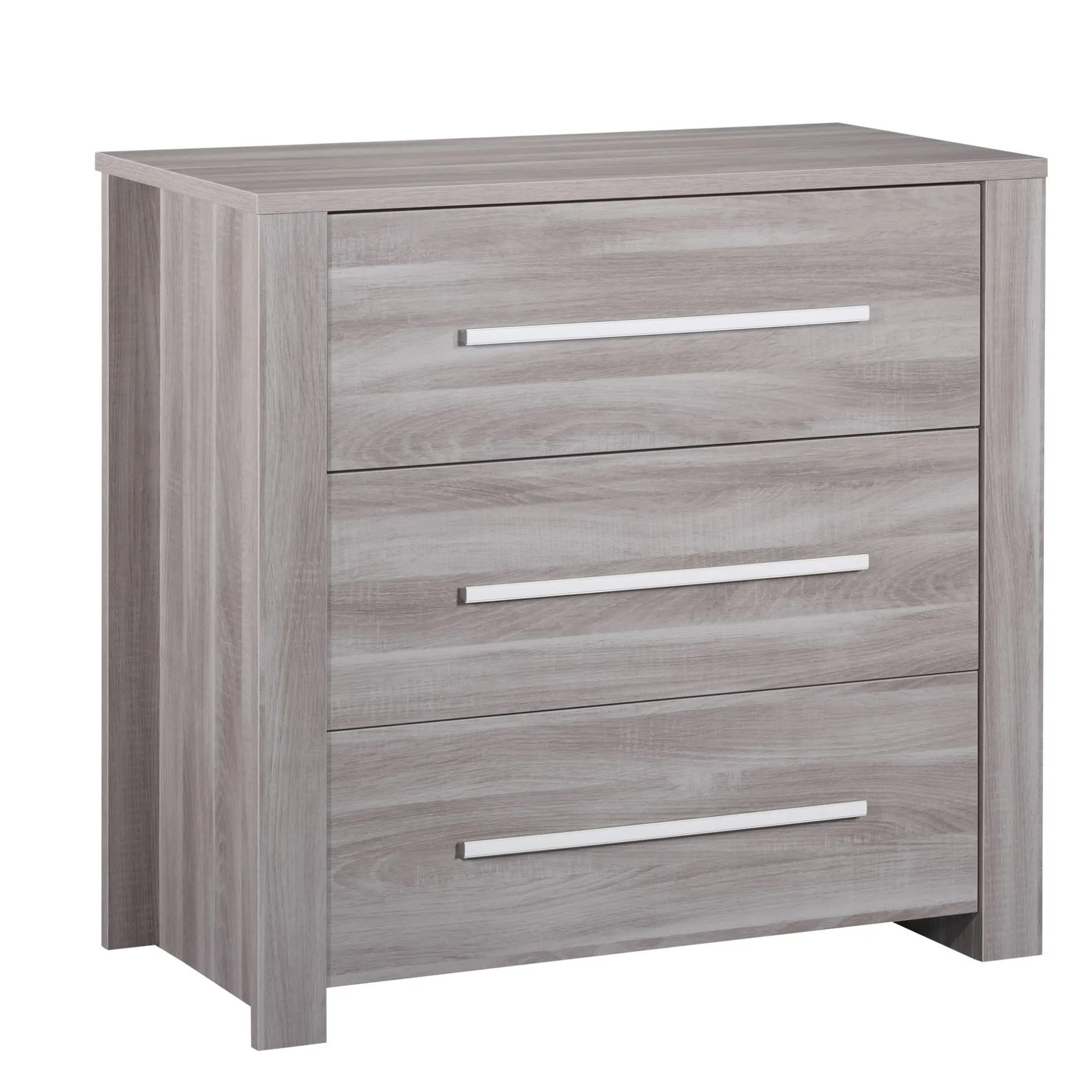 Commode 3 tiroirs de la chambre Pure. Dessus et montants en panneaux de fibres de moyenne densité (MDF) laqués blanc. Côtés et faces tiroirs en panneaux de particules mélaminés laqués une face blanc.