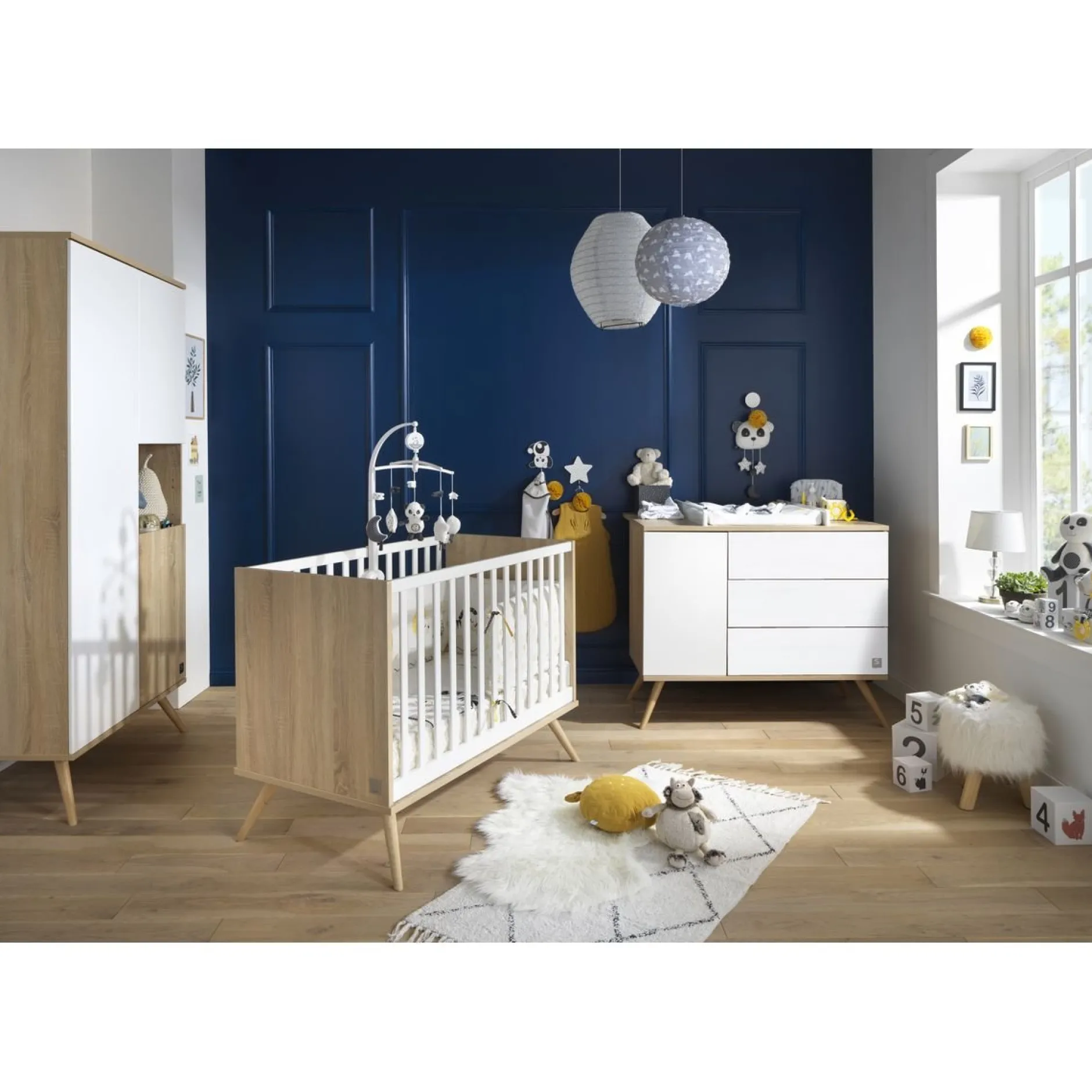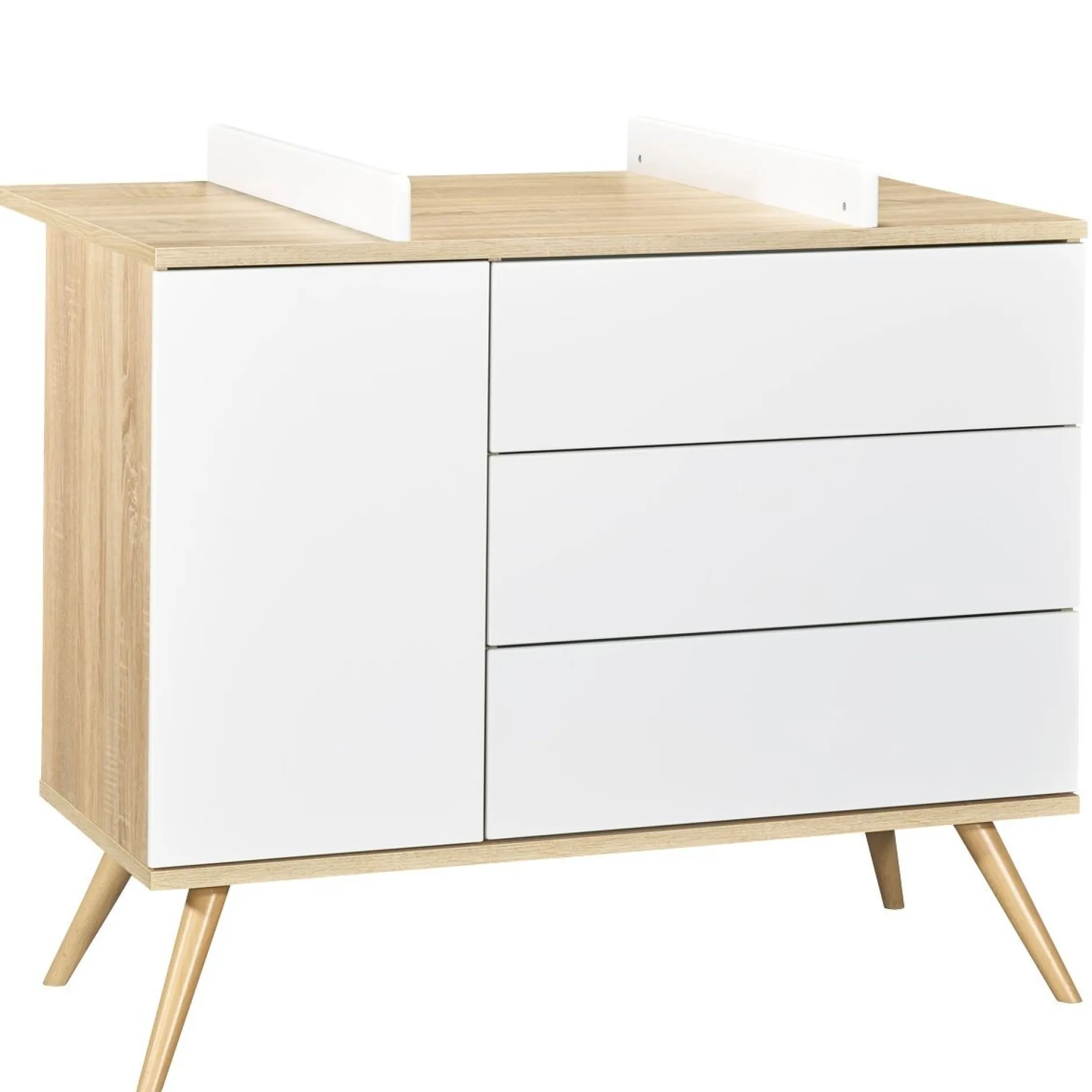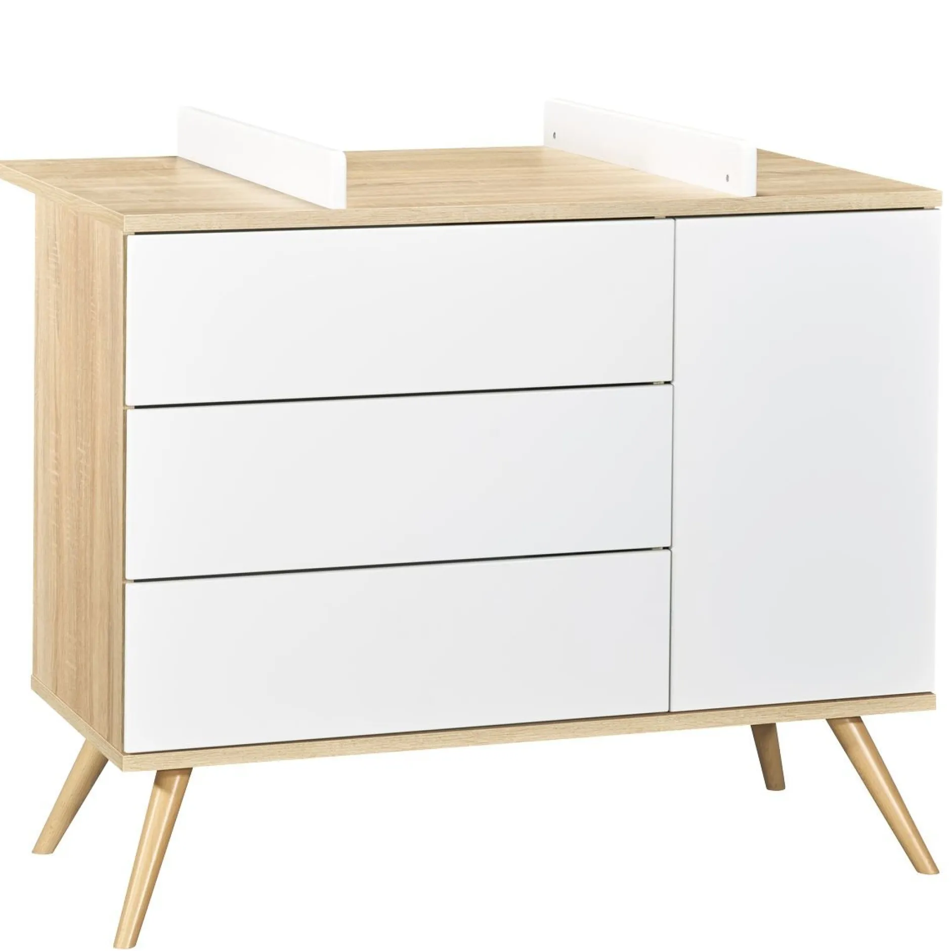 Prêt pour un saut dans le temps ? Cette commode de la collection Seventies va vous transporter dans une belle ambiance rétro et vintage. Pieds en bois coniques obliques, façades de tiroirs teintées dans un décor chêne « Sonoma Oak », porte laquée en blanc : tous les codes du mobilier rétro sont réunis dans cette commode ! Vous allez également adorer ses volumes : trois tiroirs et une porte derrière laquelle se cache une tringle. Toutes les petites affaires de bébé y seront bien organisées ! Dotés du système « pousse-lâche », les fermetures des tiroirs et de la porte sont sécurisées et facilitées. Un plan à langer de la même collection pourra être fixé sur le dessus de la commode (non inclus), vous aurez ainsi tout à portée de main.
