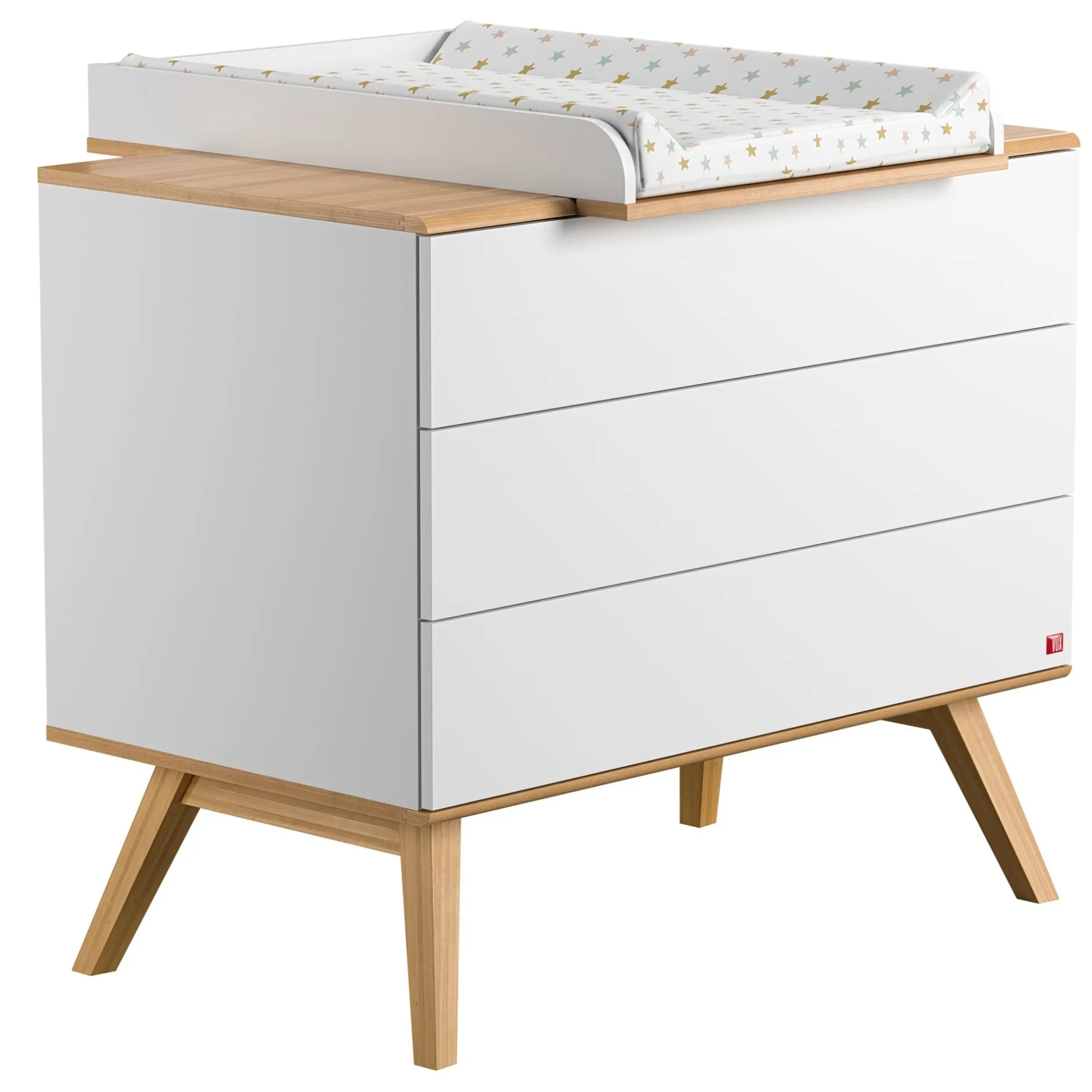 Conçue en chêne massif et mélaminé haut de gamme, cette commode design et élégante peut recevoir un en option afin de changer votre bébé face à soi. Il offre une grande surface pour le change de votre bébé et pour garder tout le nécessaire de toilette à porter de main. La bonne hauteur des bords garantit la sécurité de l’enfant et crée un environnement sûr et confortable.