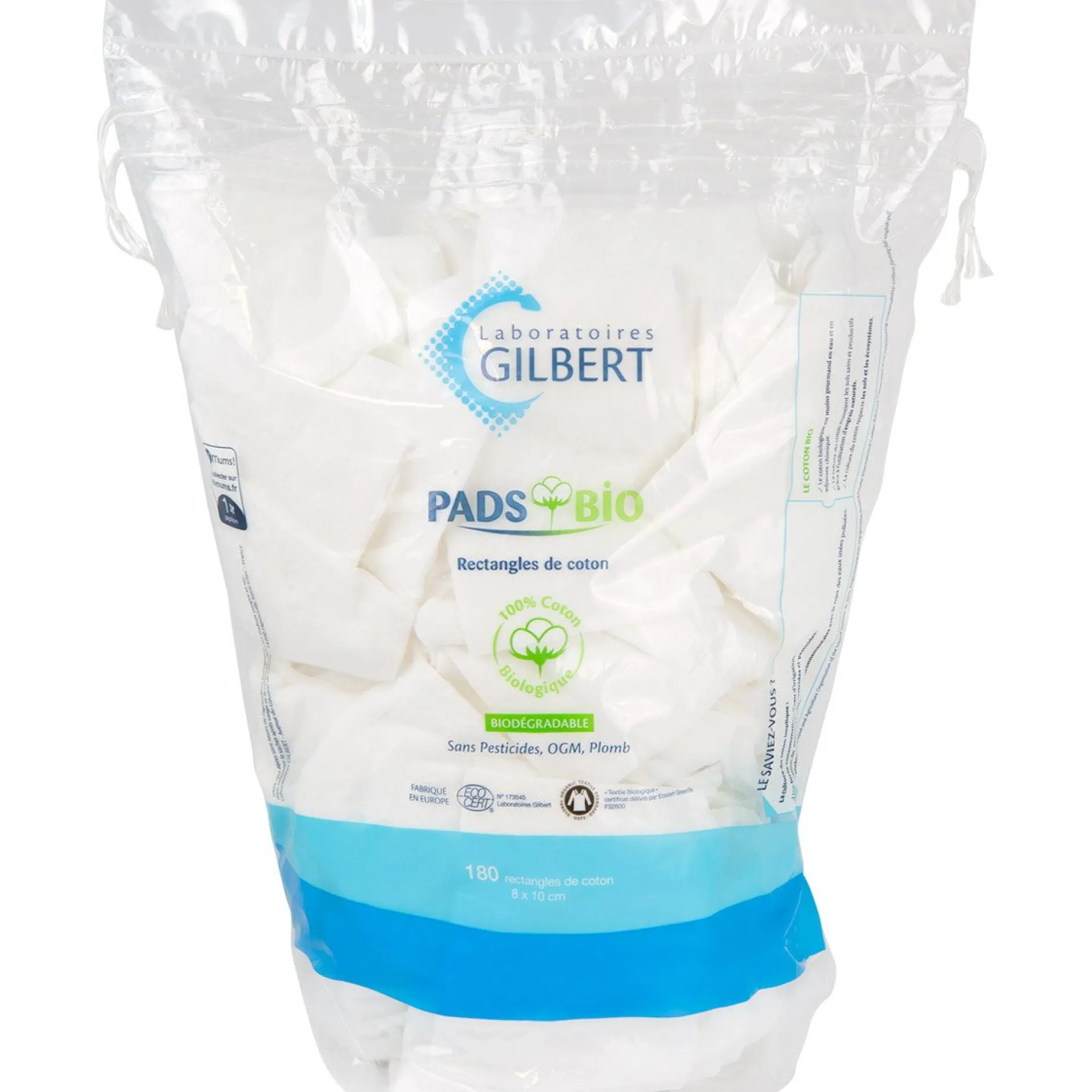 Il est important de savoir que la culture du coton conventionnel est la plus polluante de la planète car elle nécessite énormément d’eau, de pesticides et d’engrais. C’est pourquoi les laboratoires Gilbert, soucieux de la planète, ont mis au point les rectangles de coton biologiques avec un minimum de composants pour un maximum d’efficacité.