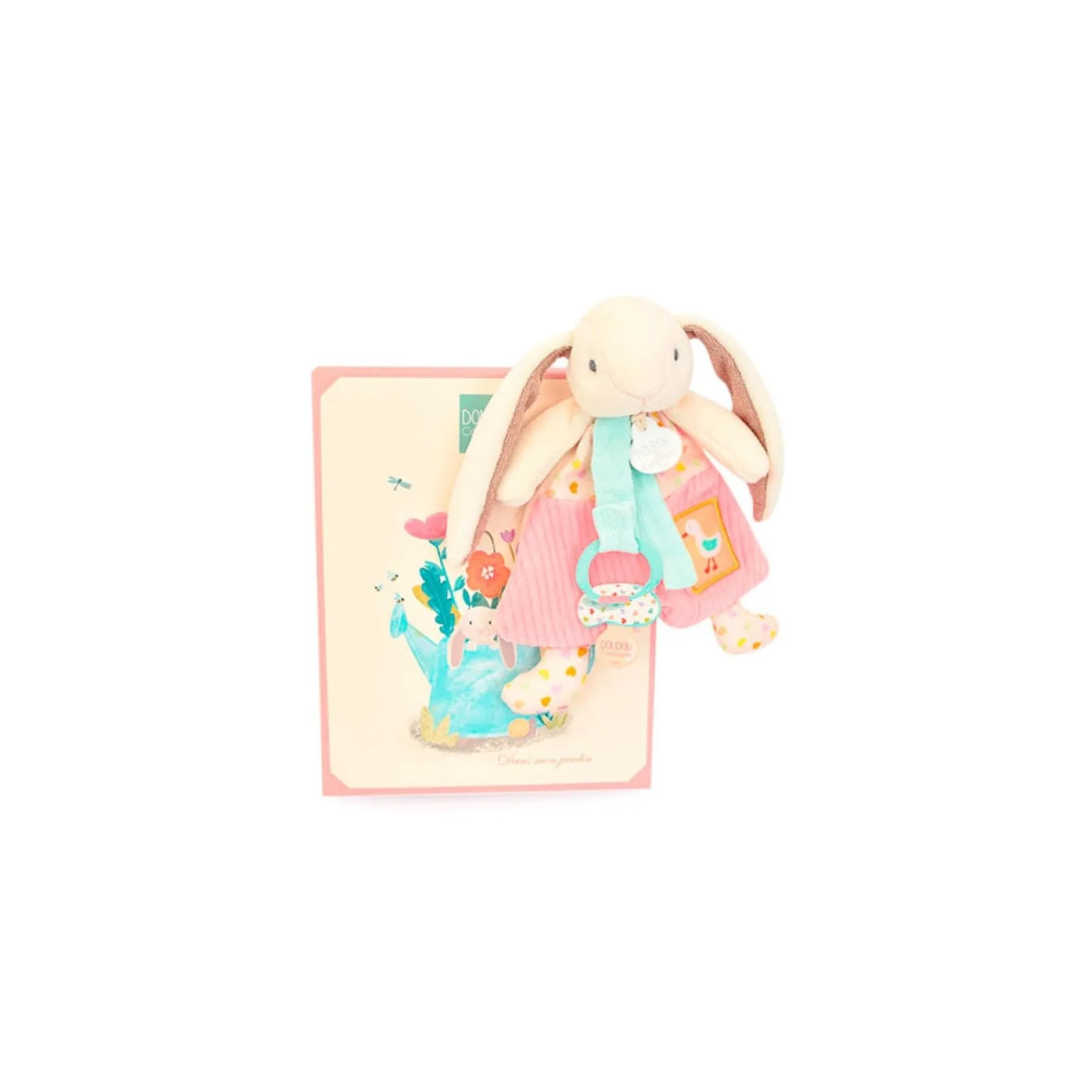 Découvrez le Doudou attache sucette Lapin Ciboulette de la collection « Dans mon jardin », un accessoire indispensable pour les bébés et leurs parents.