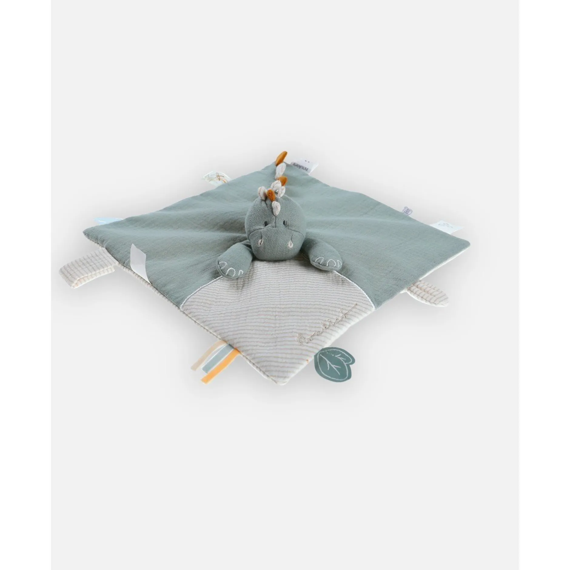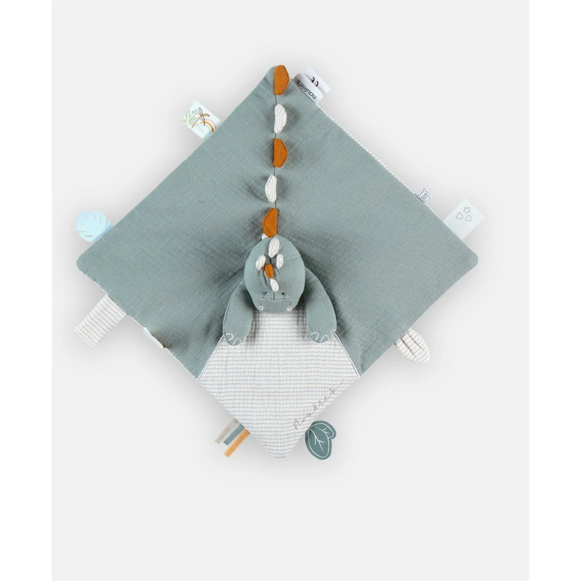 Grâce à son attache en velcro, le doudou Stegi vert eucalyptus en mousseline de coton BIO de la collection Tiga, Stegi & Ops s’attache facilement à la manche du pyjama Noukie’s ou à la tétine.