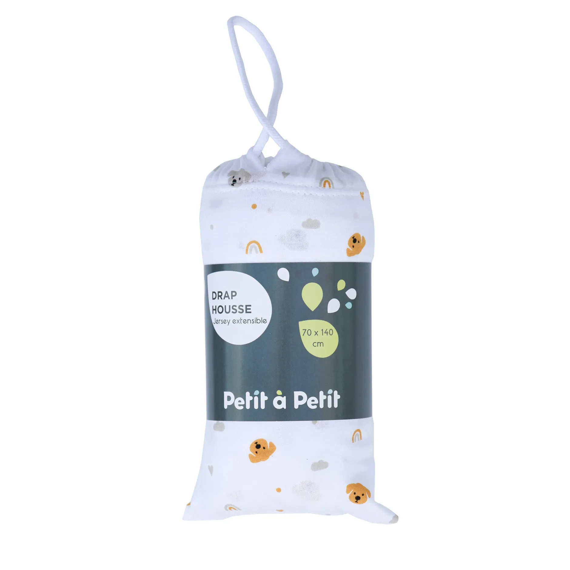 Drap housse en jersey. Existe en plusieurs coloris et en différentes tailles : 40×80 cm, 60×120 cm ou 70×140 cm.