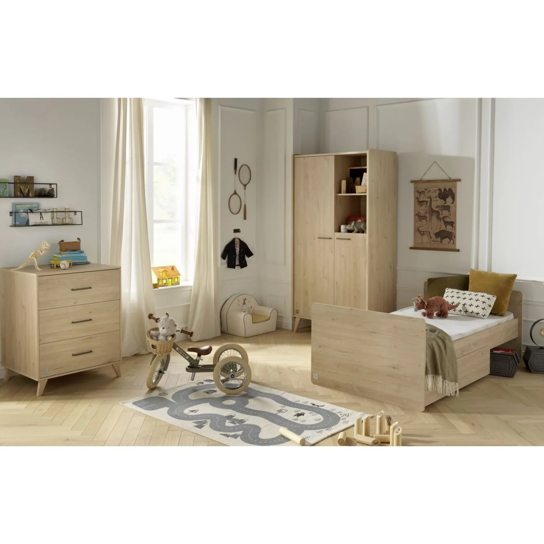 Design et évolutif ! Dès la naissance, votre bébé profitera du confort d’un lit bébé 60×120 cm et vous, vous pourrez lui faire ses soins en toute sécurité sur le meuble à langer aux nombreux rangements qui lui est accolé. Plus tard, cet ensemble se transforme en lit enfant 90×190 cm (sommier vendu séparément), accompagné d’une commode indépendante au style rétro.