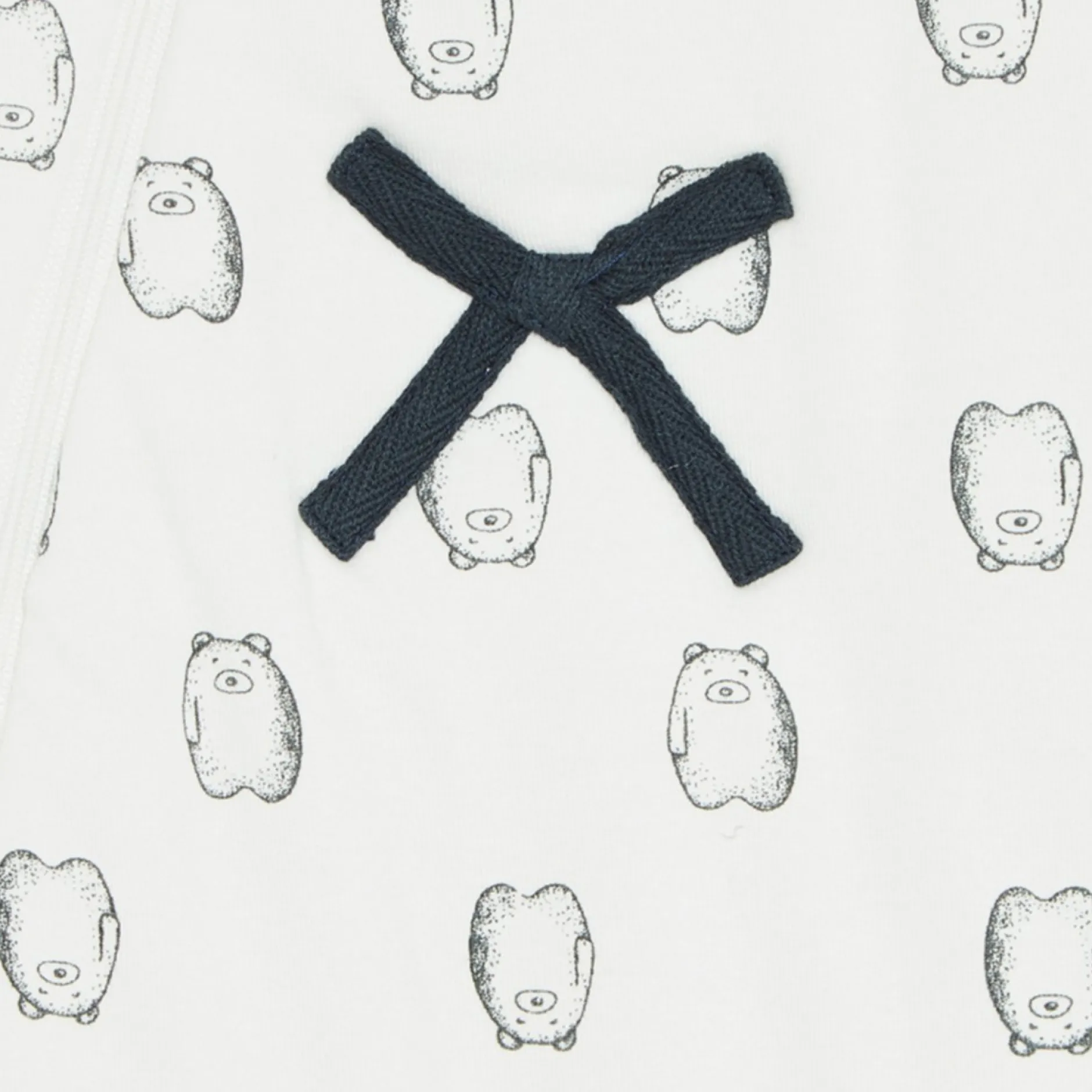 Gigoteuse MARESE en côte 1*1 en coton bio écru avec imprimés petits oursons et doublée de jersey écru . Ouverture par zip sur le côté et sur le bas pour faciliter le passage du bébé. Très joli nœud en tresse chevrons en gris anthracite sur le devant. Gigoteuse évolutive par système de pressions au dos et du coup qui s’adapte du 6 mois au 18 mois. Garnie de ouate pour le confort et la chaleur.