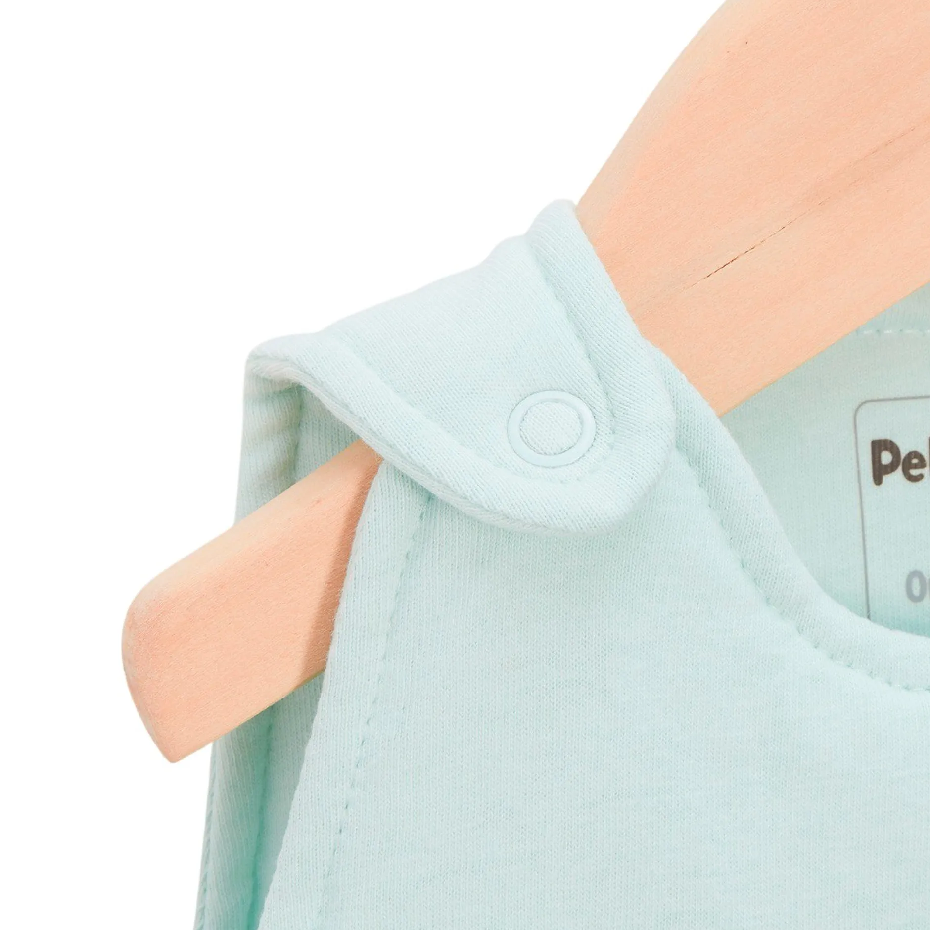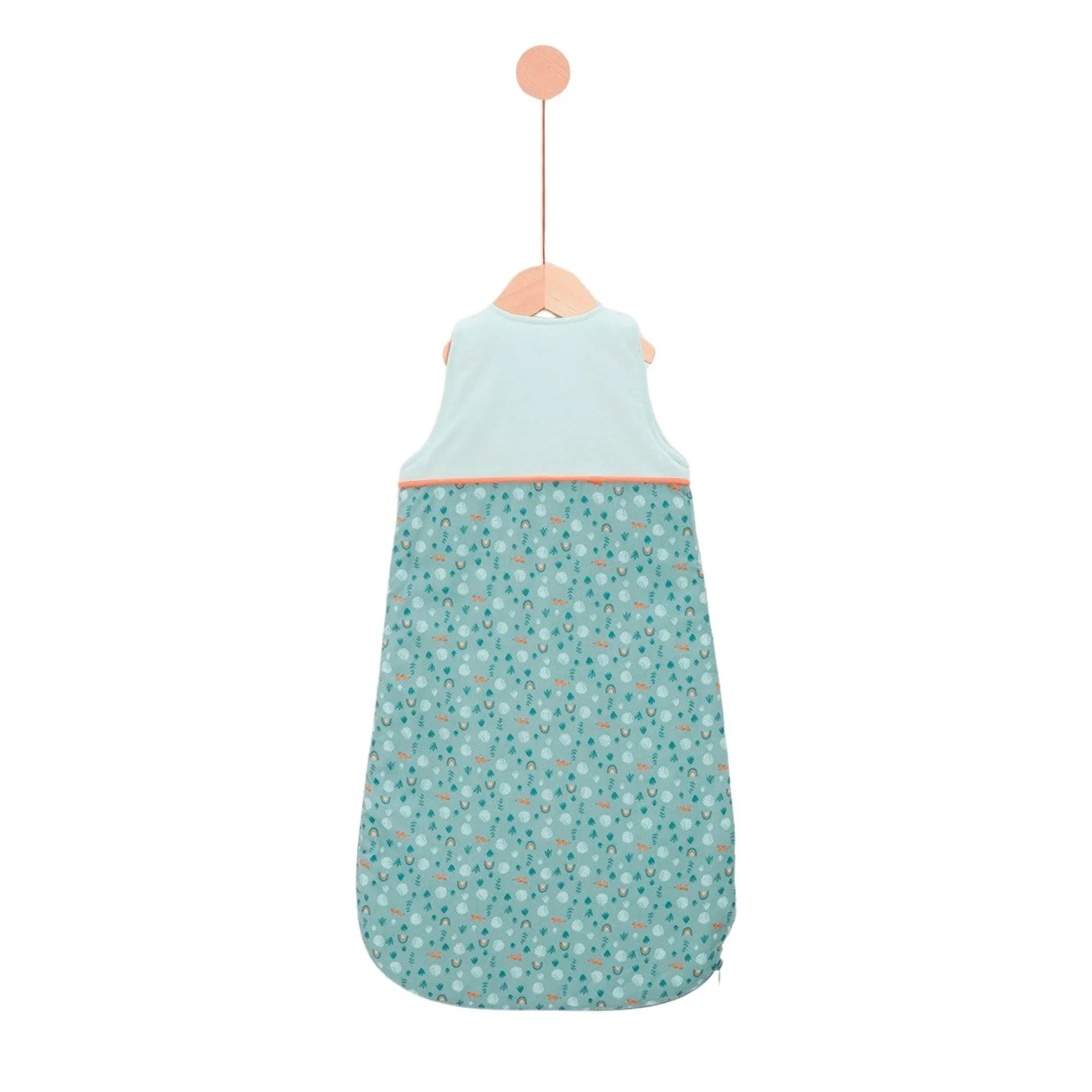 Gigoteuse Petit à petit en voile imprimé jungle sur fond vert et en jersey vert d’eau. Pressions aux épaules et zip sur le côté pour permettre une bonne ouverture pour une mise en place aisée de bébé. Cette gigoteuse a une jolie animation sur le devant avec un petit léopard. La taille de ce produit est 0-6 mois, TOG = 2,2