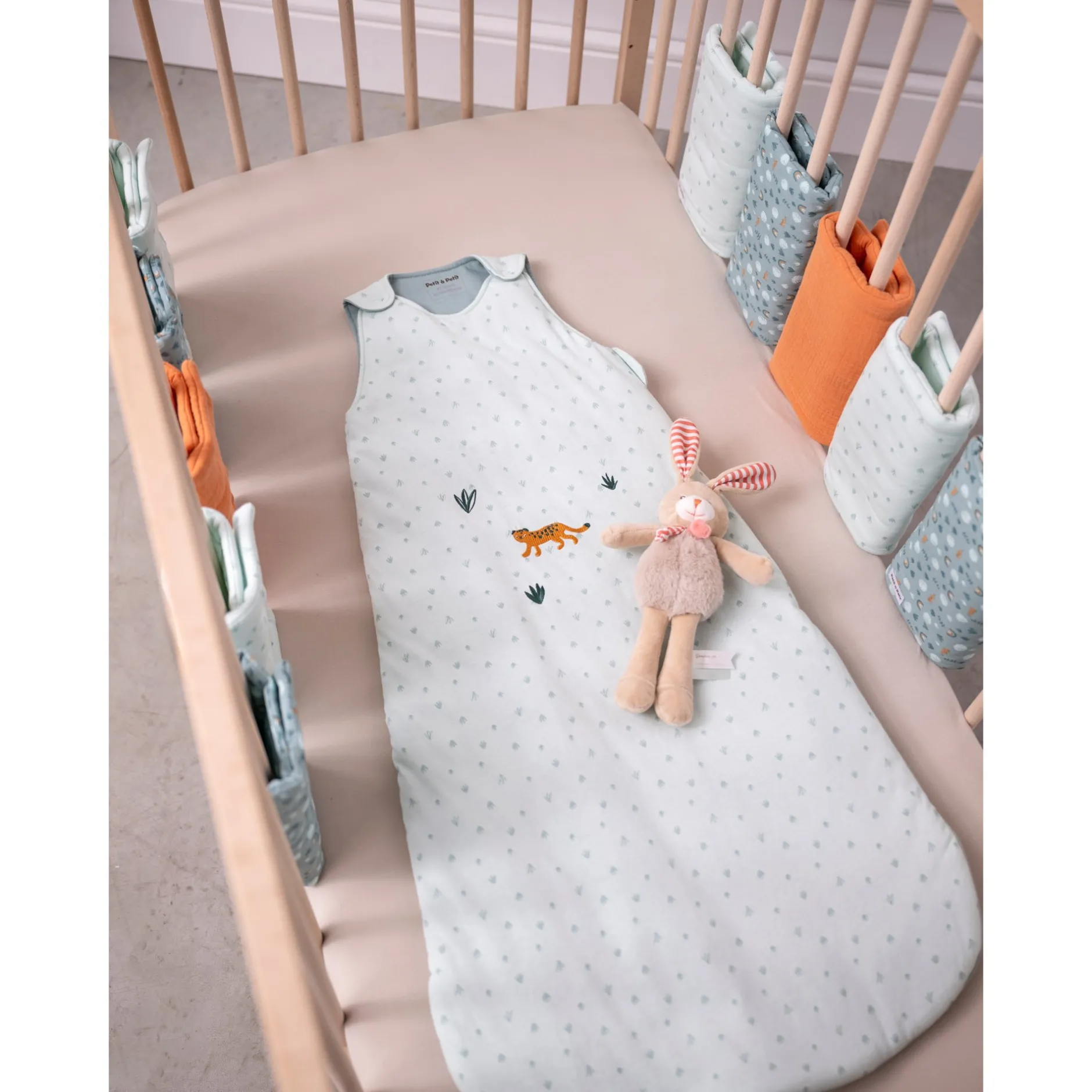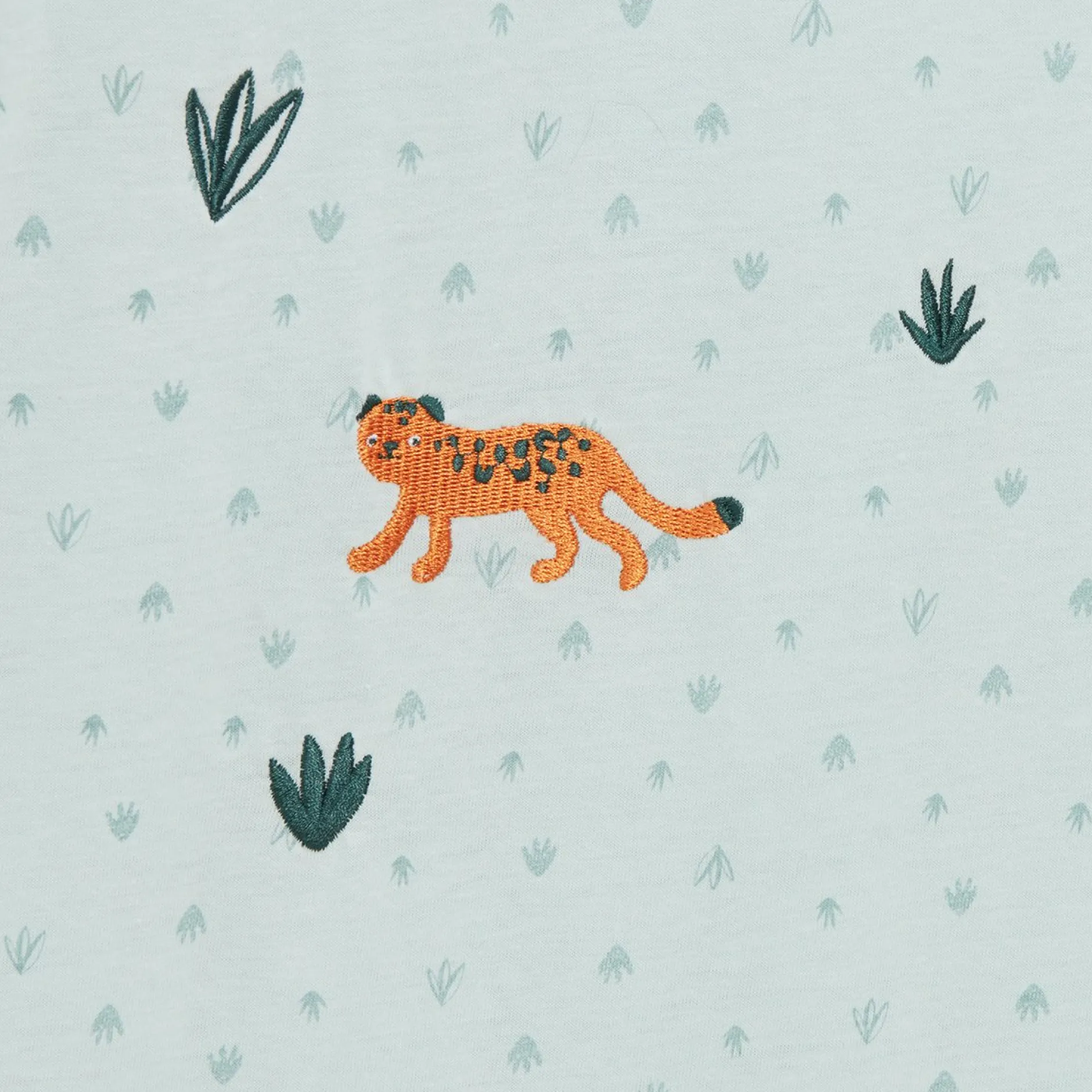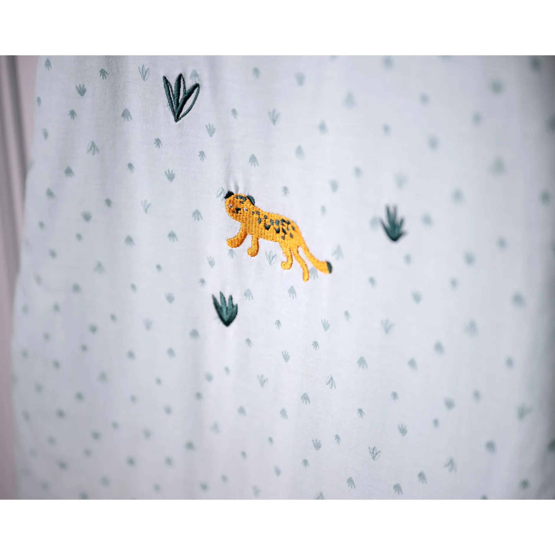 Gigoteuse Petit à petit en jersey vert d’eau avec imprimé végétation. Pressions aux épaules et zip sur le côté pour permettre une bonne ouverture pour une mise en place aisée de bébé. Cette gigoteuse a un joli léopard sur le devant très affectif et ludique. La taille de ce produit est 6-18 mois, TOG =2,4.