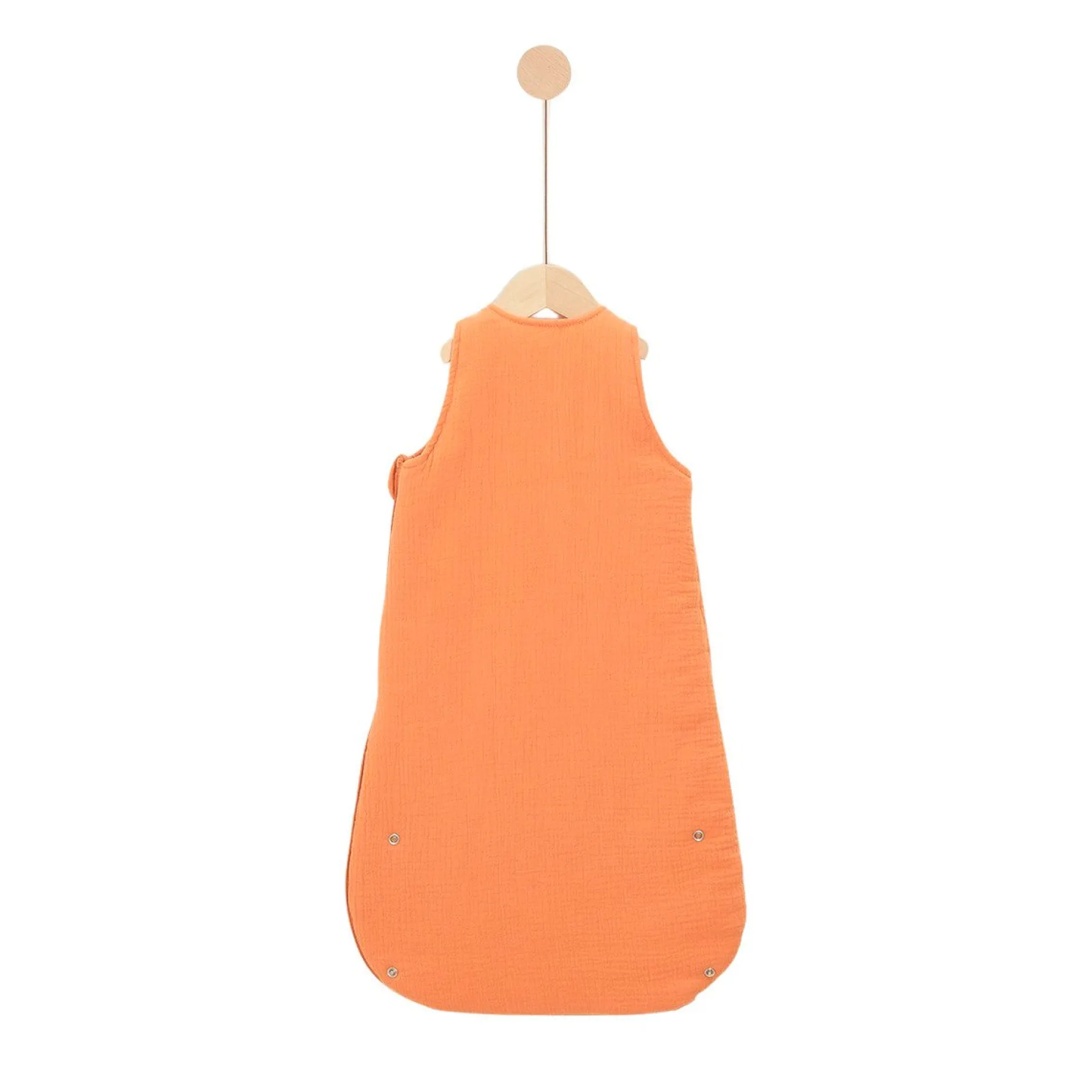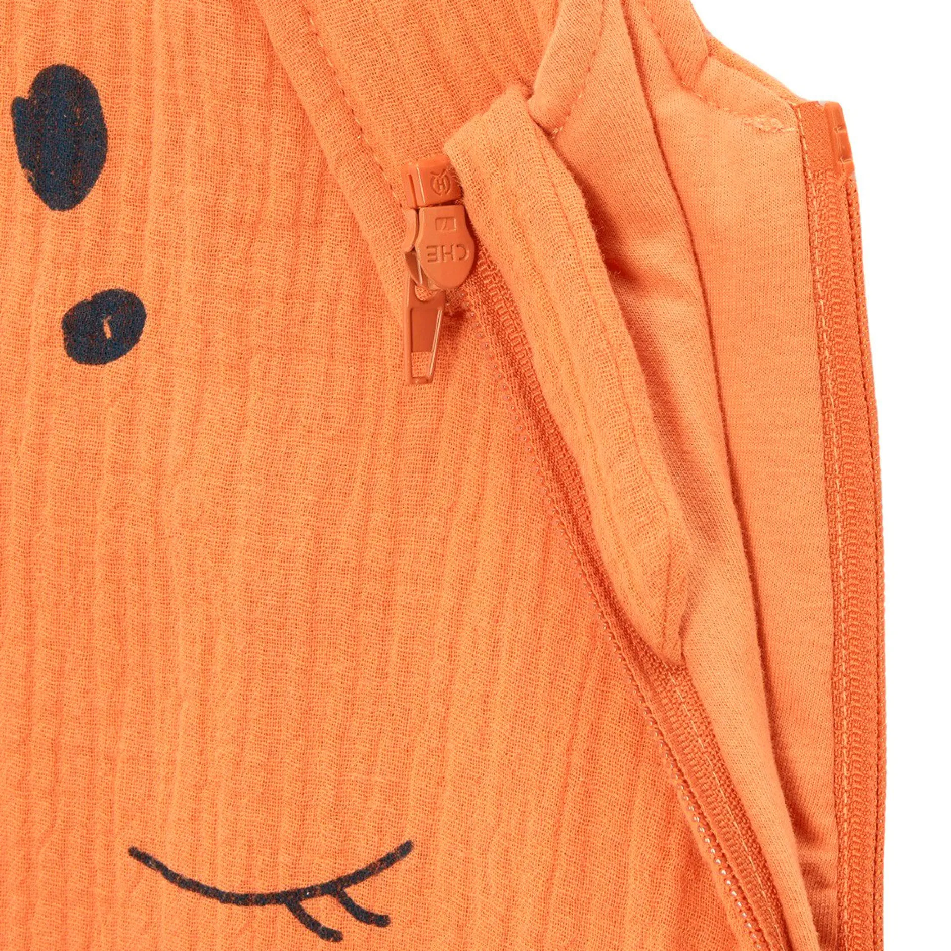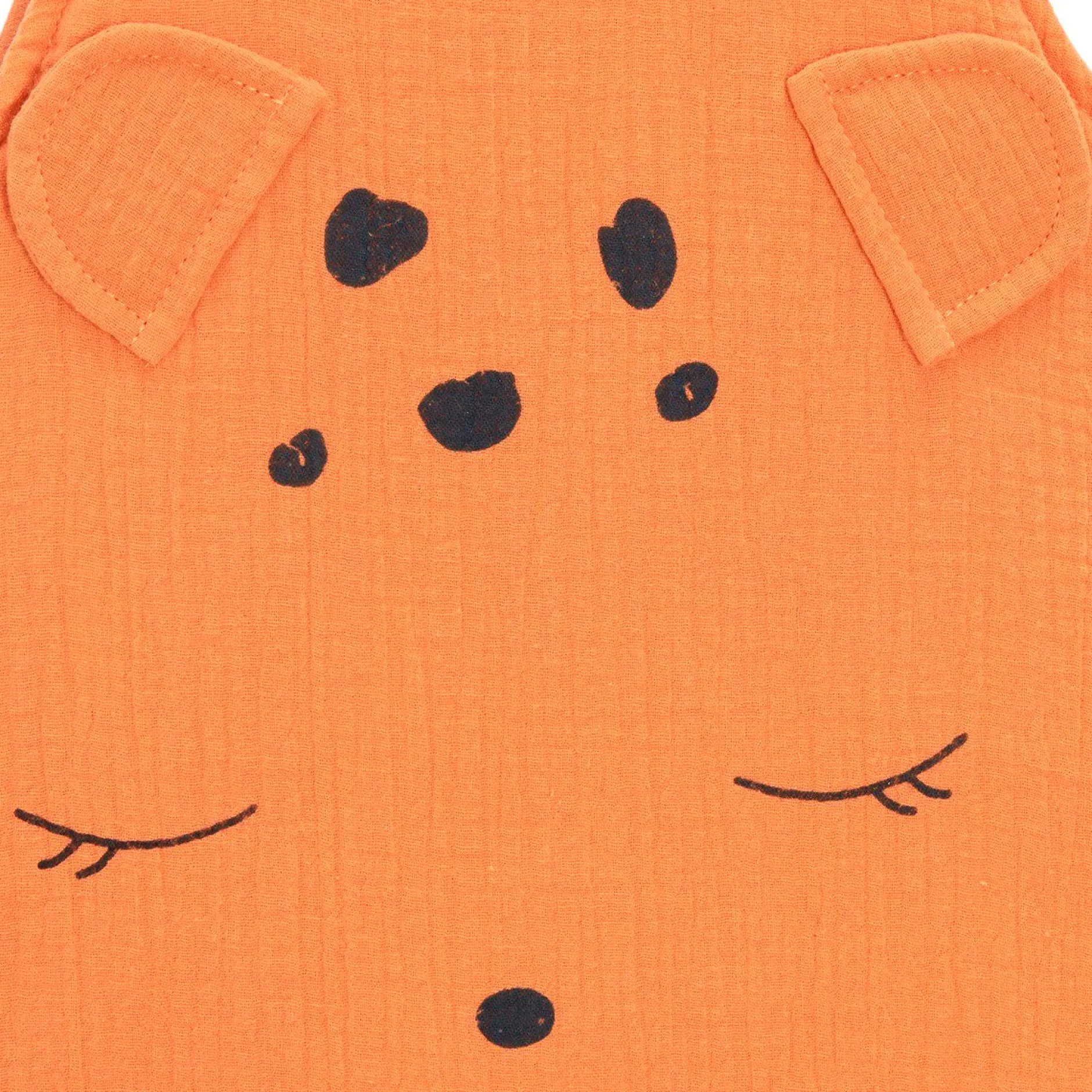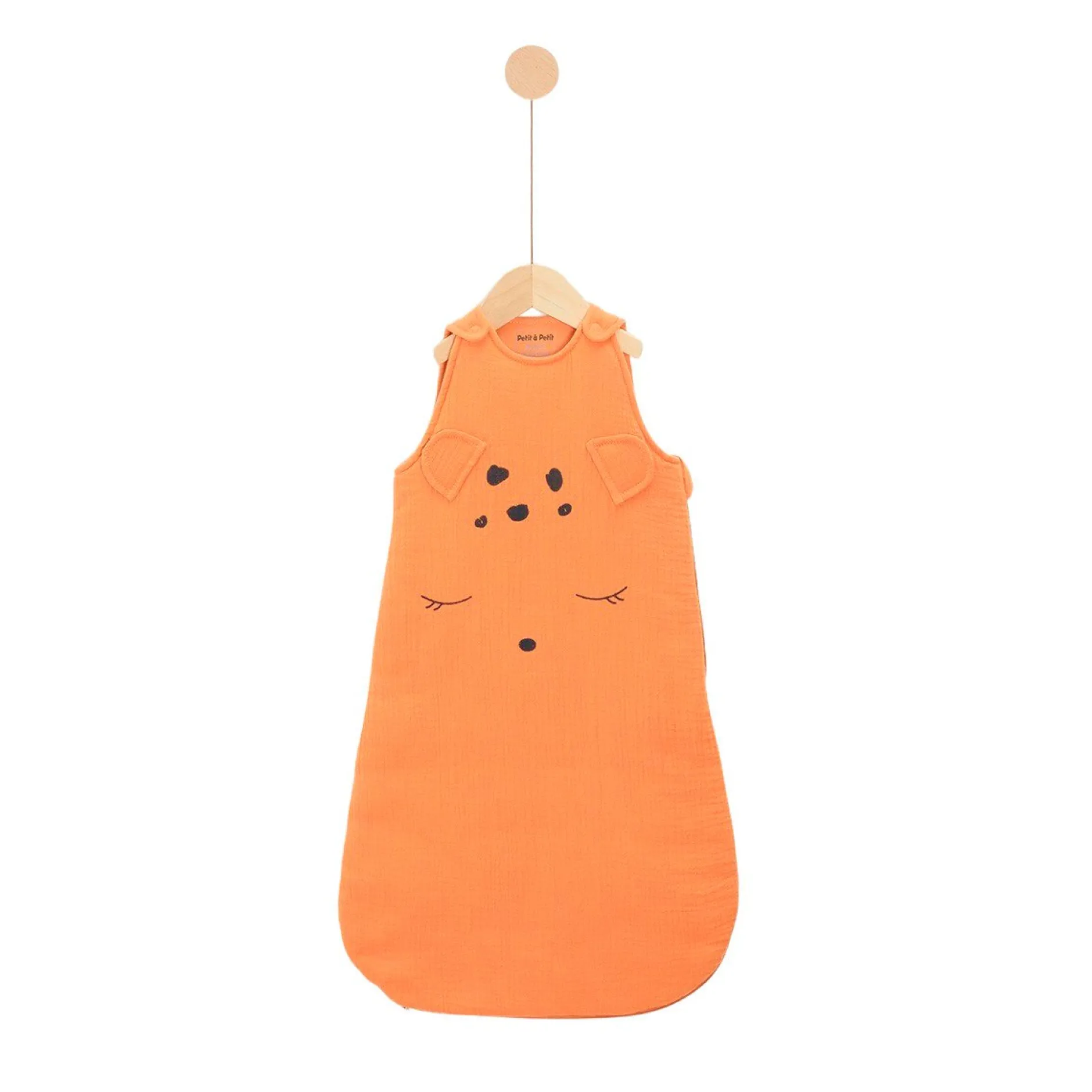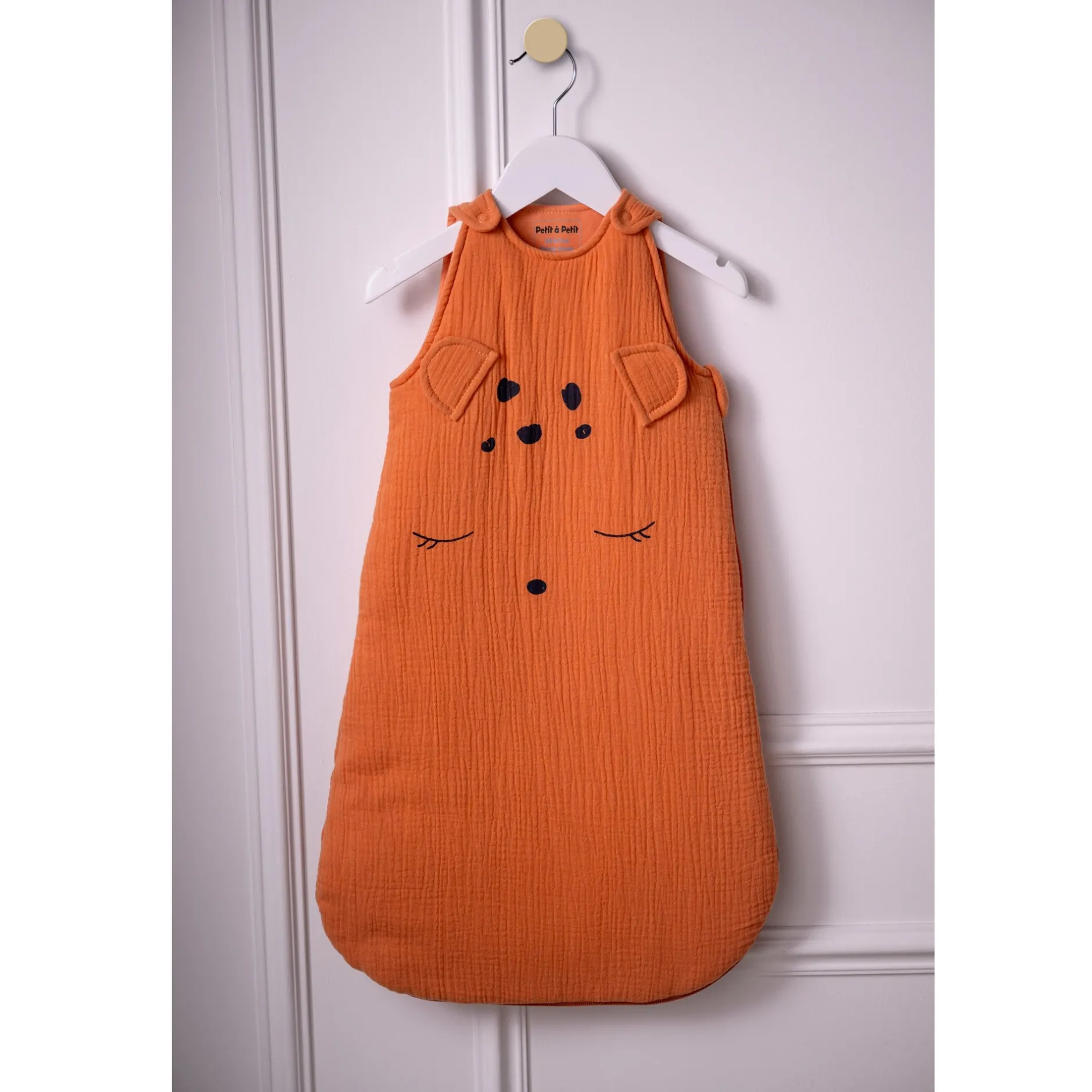 Gigoteuse Petit à petit en mousseline de gaze orange muscade. Pressions aux épaules et zip sur le côté pour permettre une bonne ouverture pour une mise en place aisée de bébé. Cette gigoteuse a une jolie tête de félin sur le devant très affective et des éléments en doré. La taille de ce produit est 0-6 mois, TOG = 2,5.