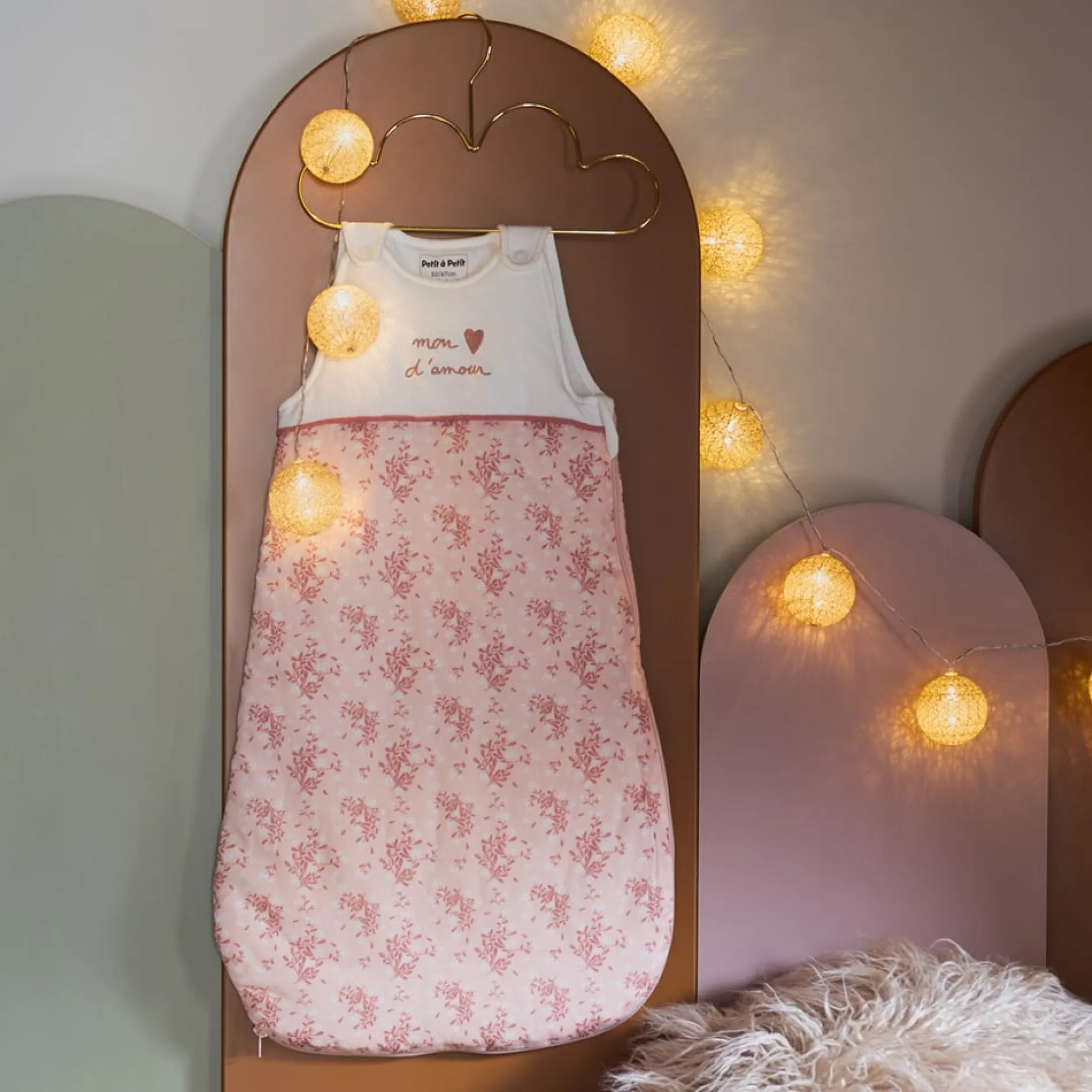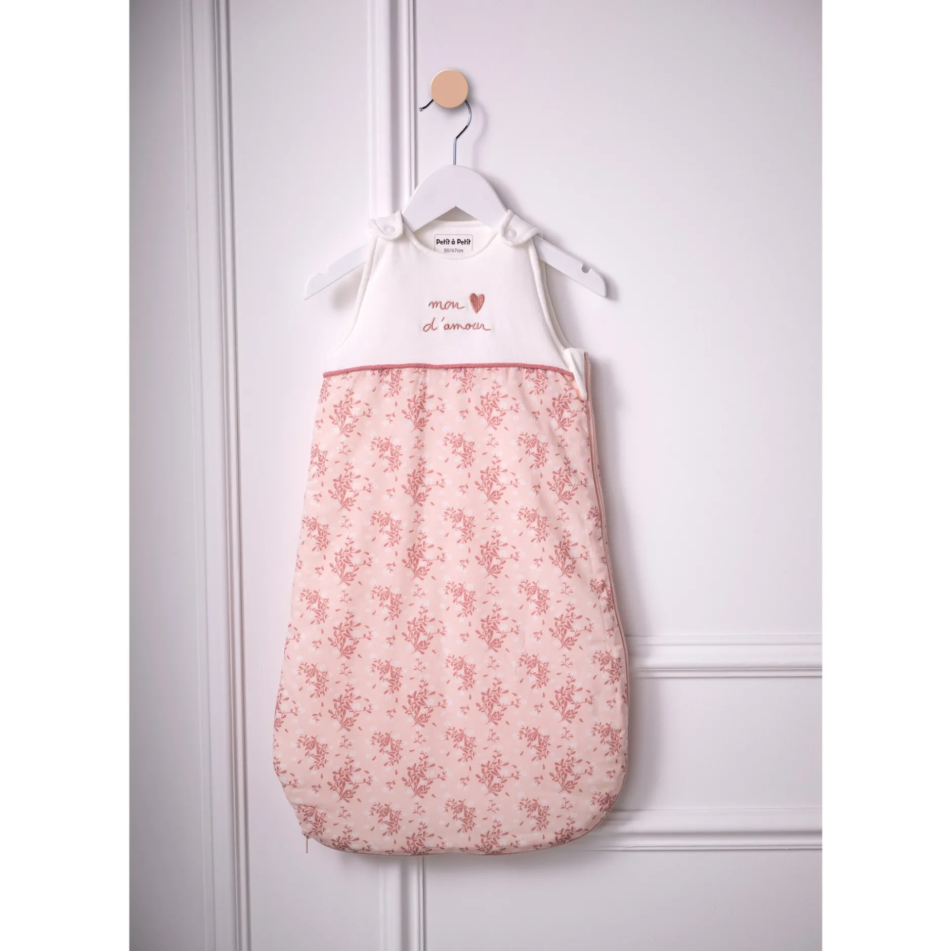 Gigoteuse Petit à petit en voile imprimé floral et en jersey écru. Pressions aux épaules et zip sur le côté pour permettre une bonne ouverture pour une mise en place aisée de bébé. Cette gigoteuse a un joli texte brodé sur le devant « Mon amour ». La taille de ce produit est 0-6 mois. TOG = 2,6