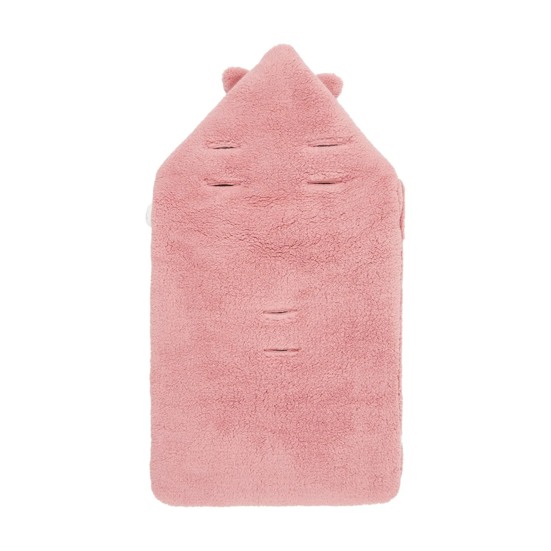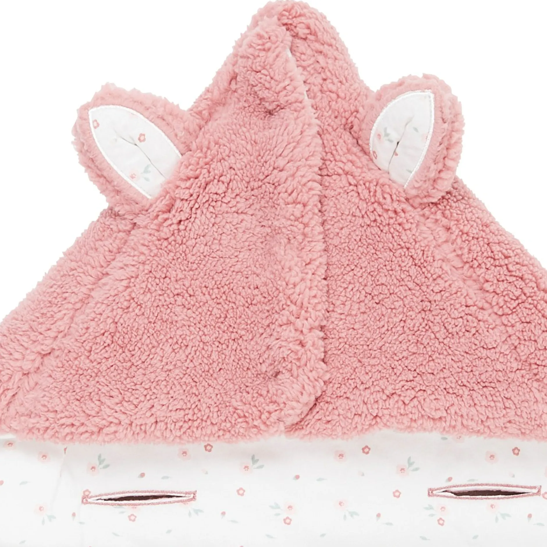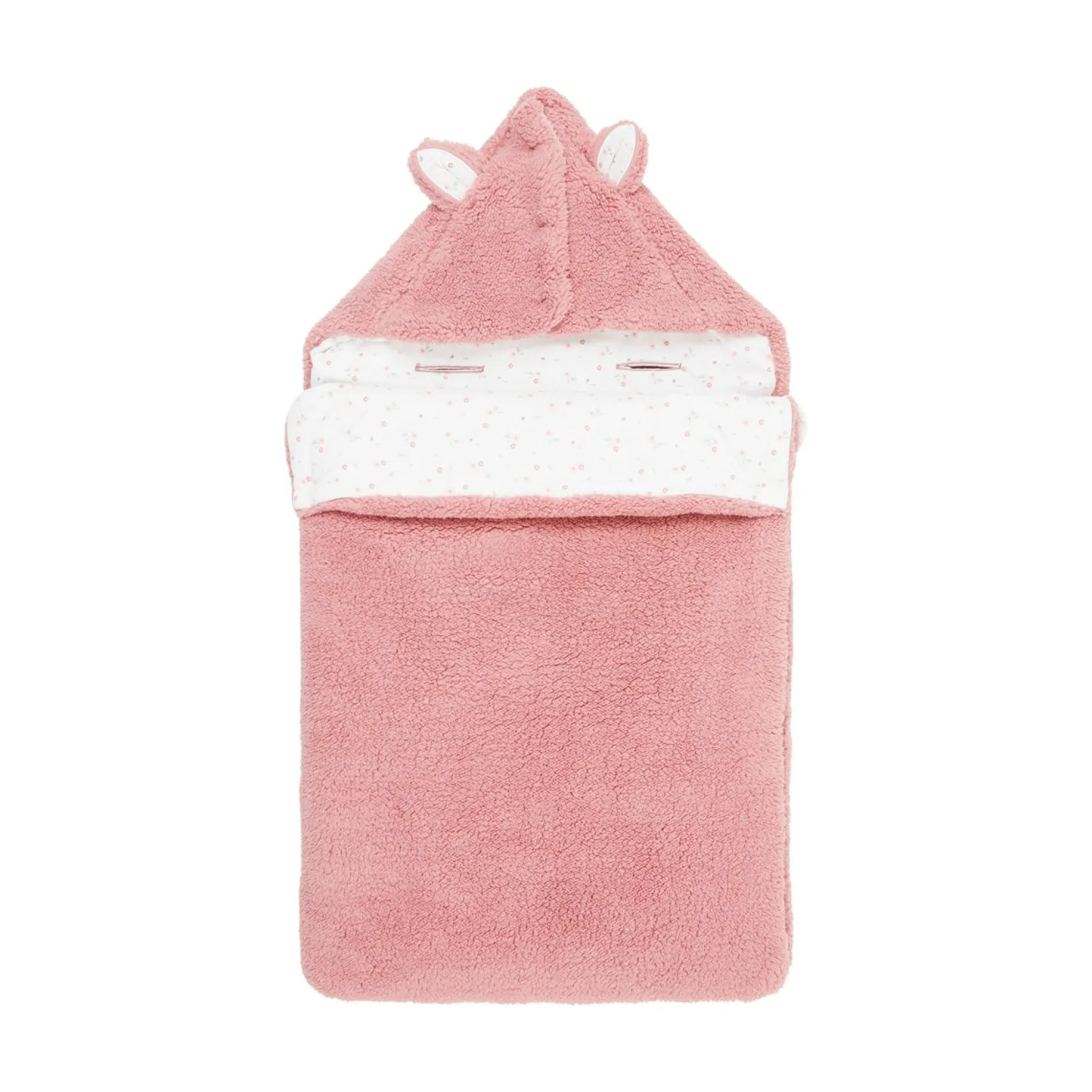 La forme est à la fois cocoon et très fonctionnelle : ouverture par zip sur le côté pour ouvrir entièrement le produit sans à avoir à trop manipuler bébé. La capuche peut se mettre par des pressions pour couvrir la tête de bébé et la maintenir au chaud. Elle est ludique et affective avec ses petites oreilles en volume. Mais sinon la capuche peut se rabattre à plat sur le devant pour le lit.