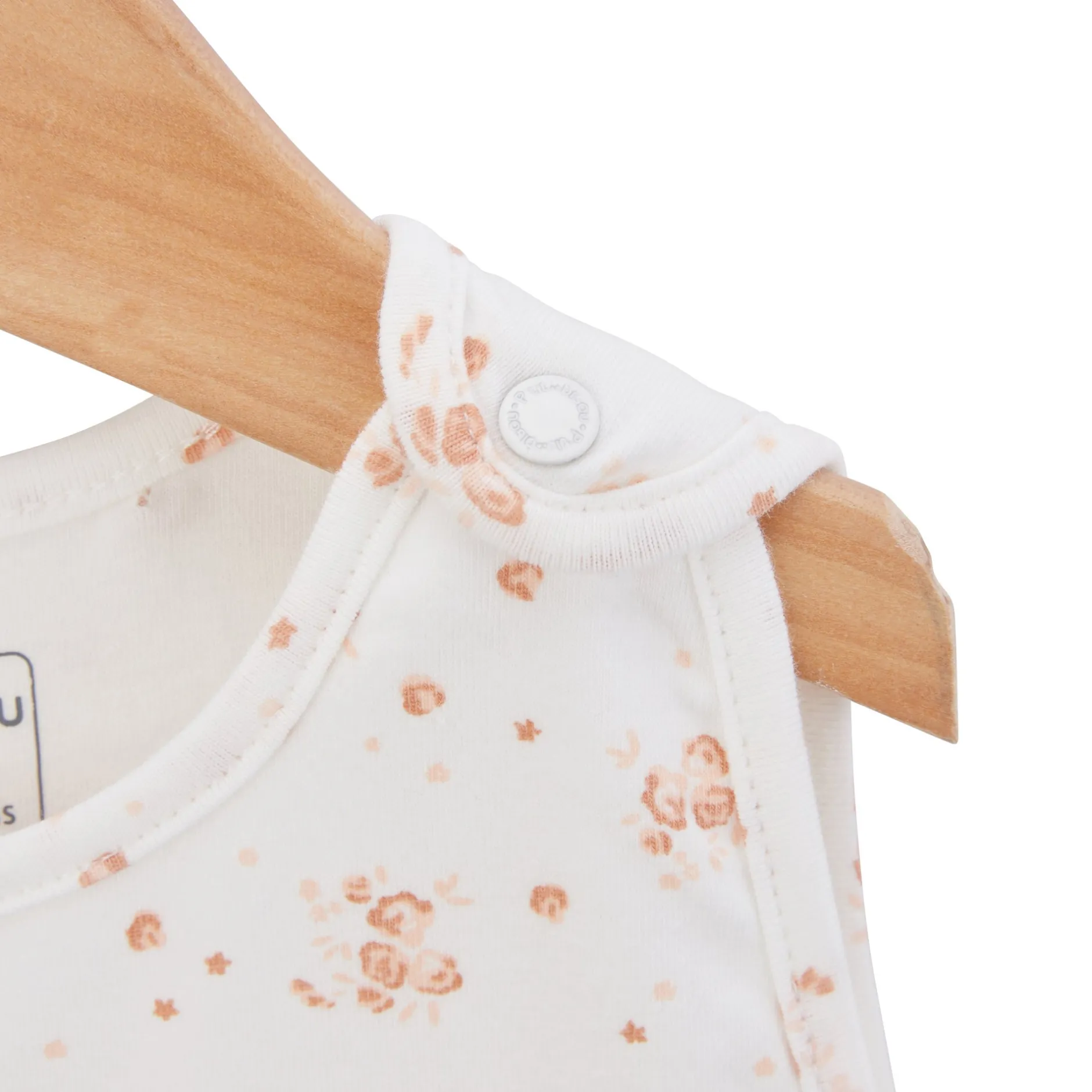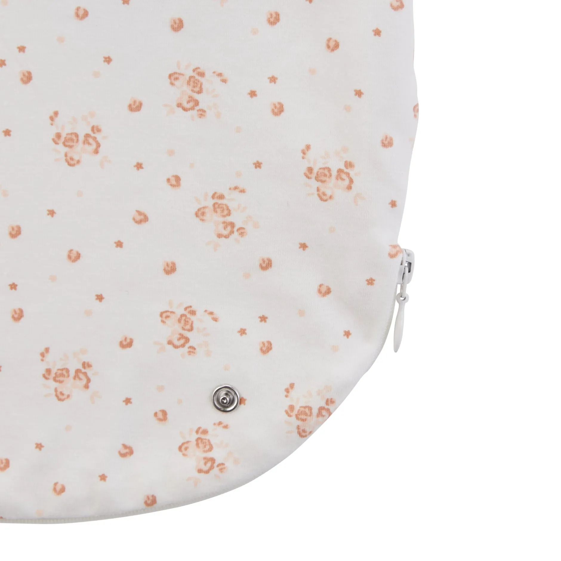 Gigoteuse P’tit Bisou en jersey motif floral en camaïeu de rose sur fond écru. Doublée de jersey pour le confort mais non ouatinée car l’utilisation est une gigoteuse légère en période estivale quand les températures s’élèvent. Ouverture par zip sur le côté et pressions aux épaules. Cette gigoteuse est ajustable derrière par pressions pour la raccourcir et s’adapter à des bébés plus petits.