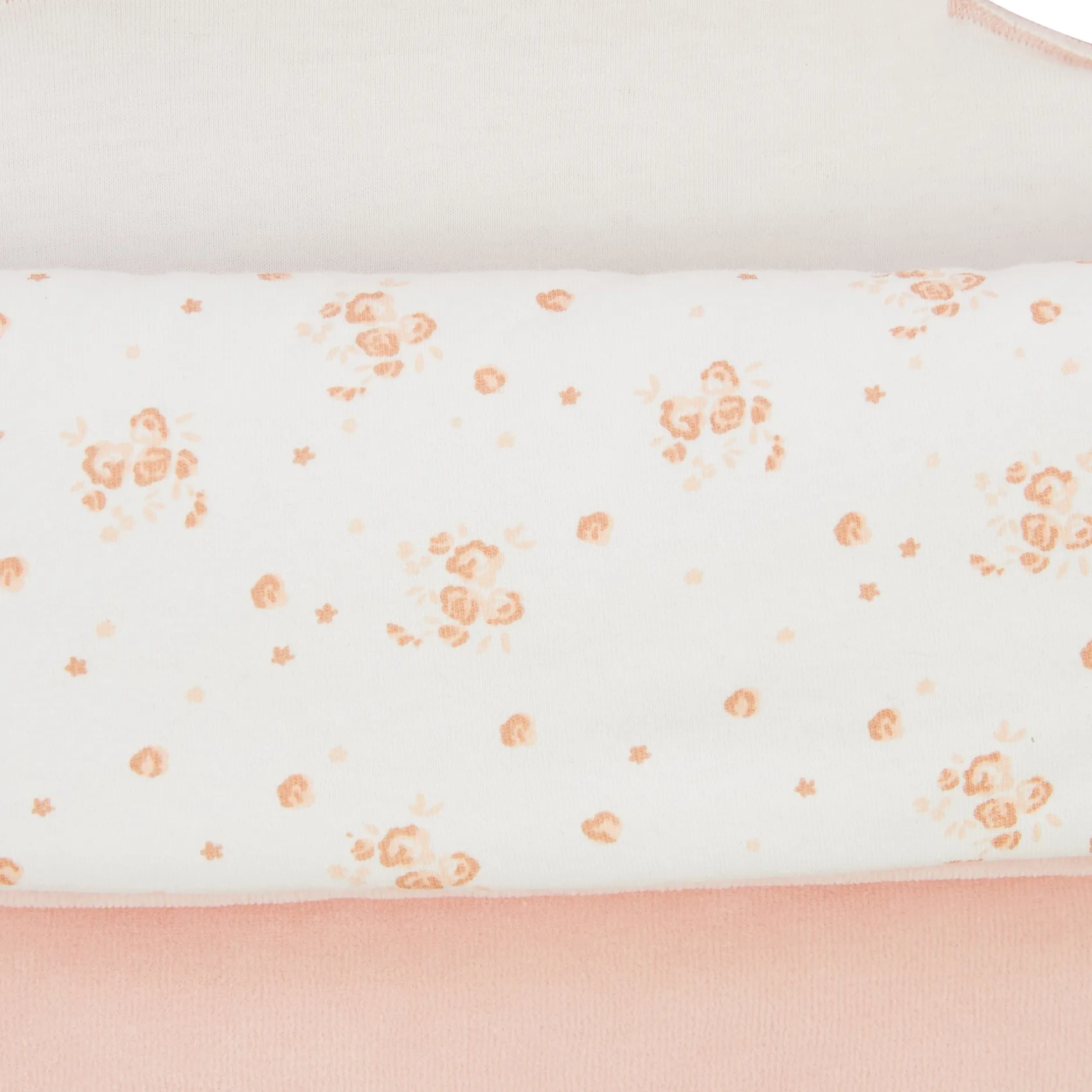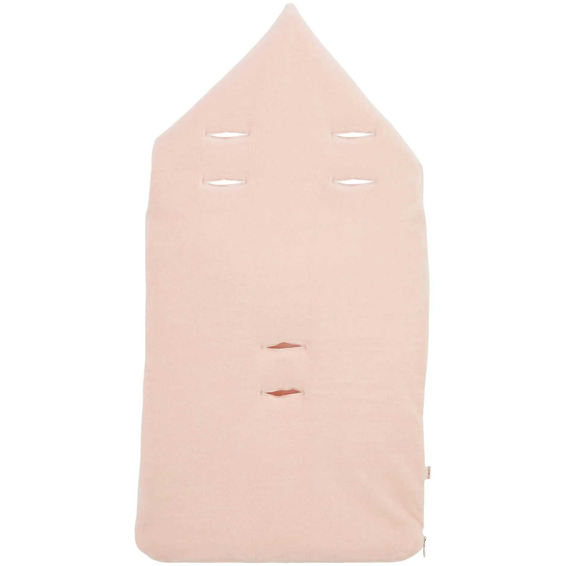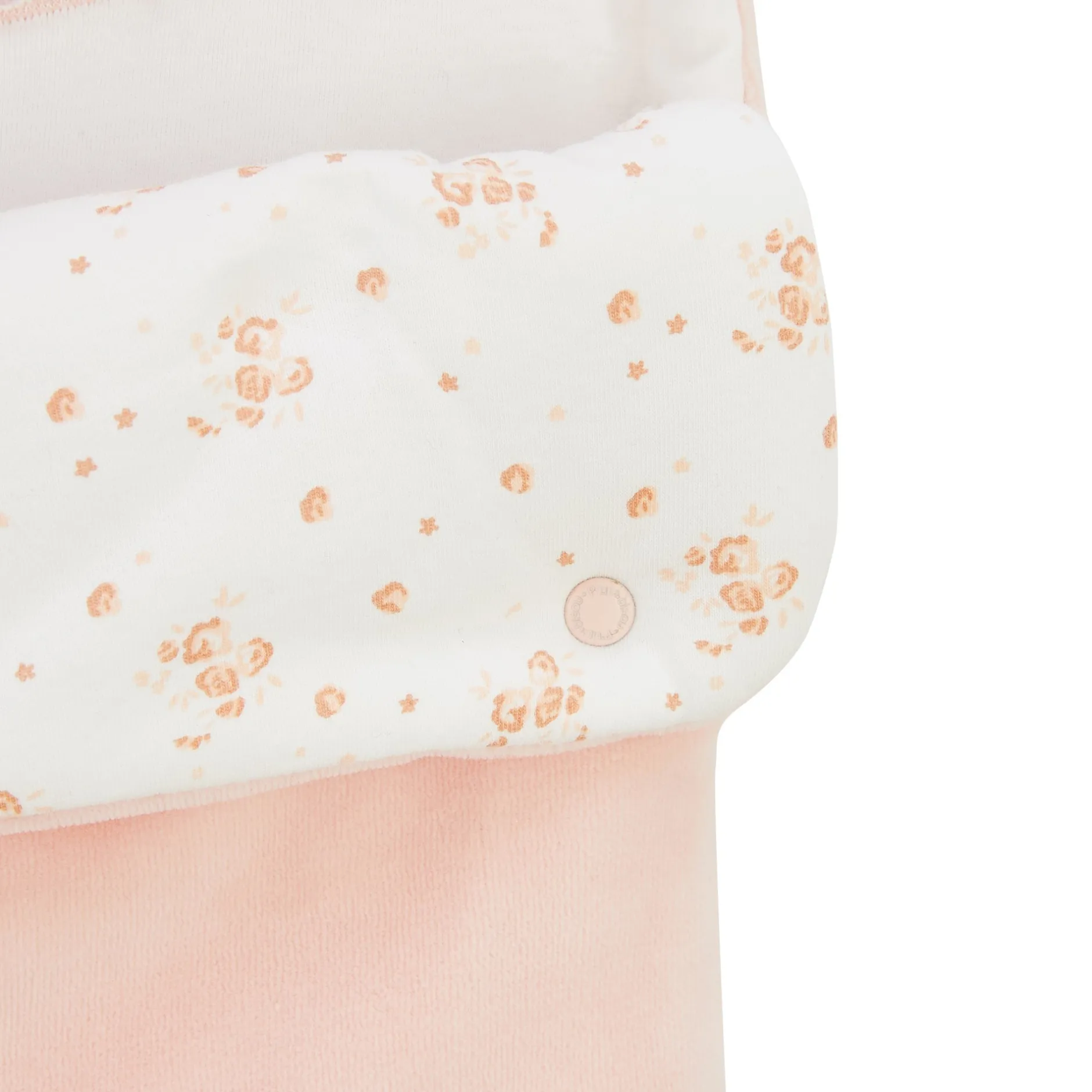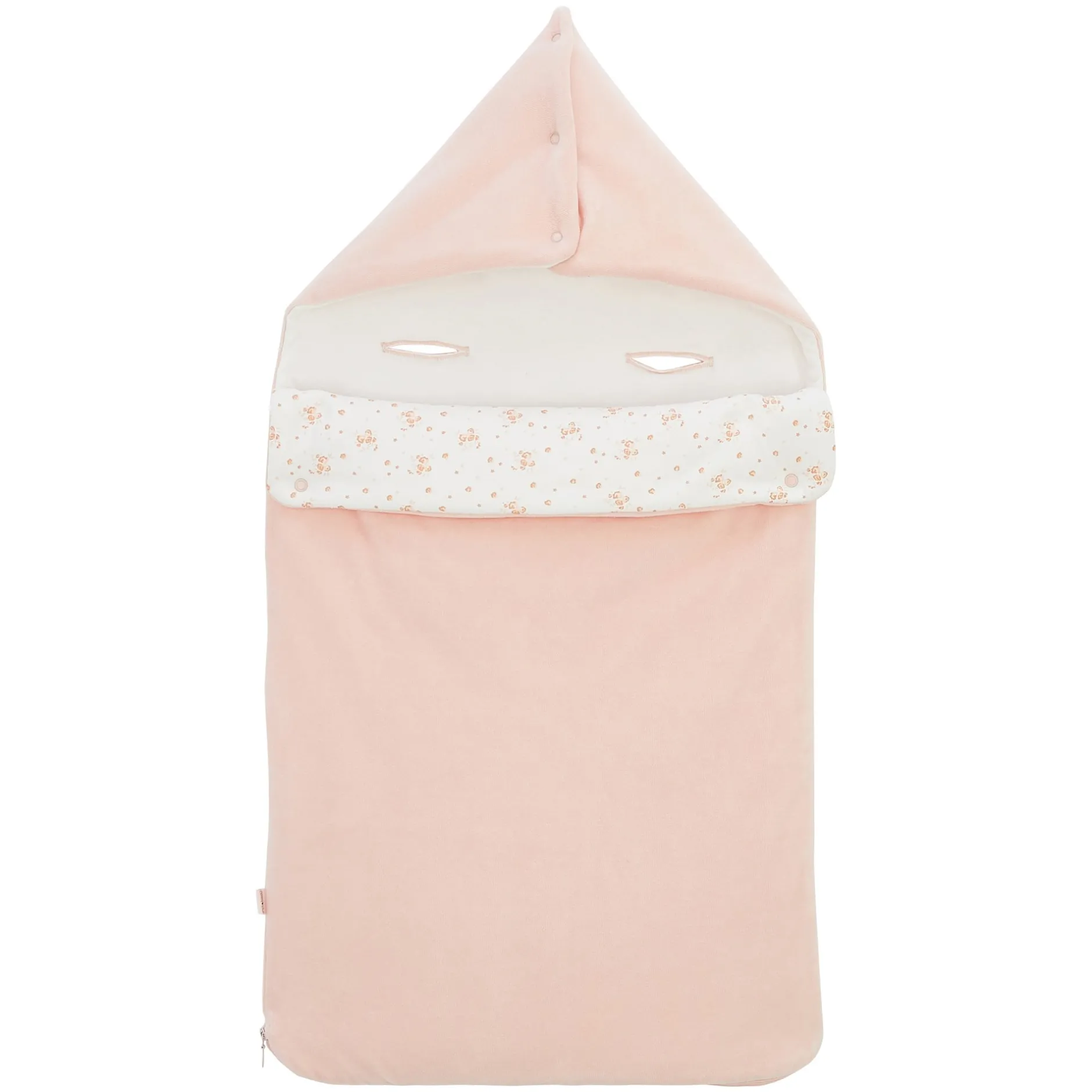 Nid d’ange P’tit Bisou en velours rose pâle doublée de jersey à motifs fleuris en camaieu de roses sur fond écru . Zip sur le côté pour plus de fonctionnalité permettant une ouverture totale, ce qui évite de trop manipuler bébé. La parfaite duvette qui suivra bébé dans ses déplacements et s’adaptera dans le cosy ou nacelle avec les ouvertures au dos qui permettent le passage des sangles au dos. Il peut avoir une fonctionnalité aussi de capuche pour couvrir la tête de bébé quand il fait froid grâce à des pressions.