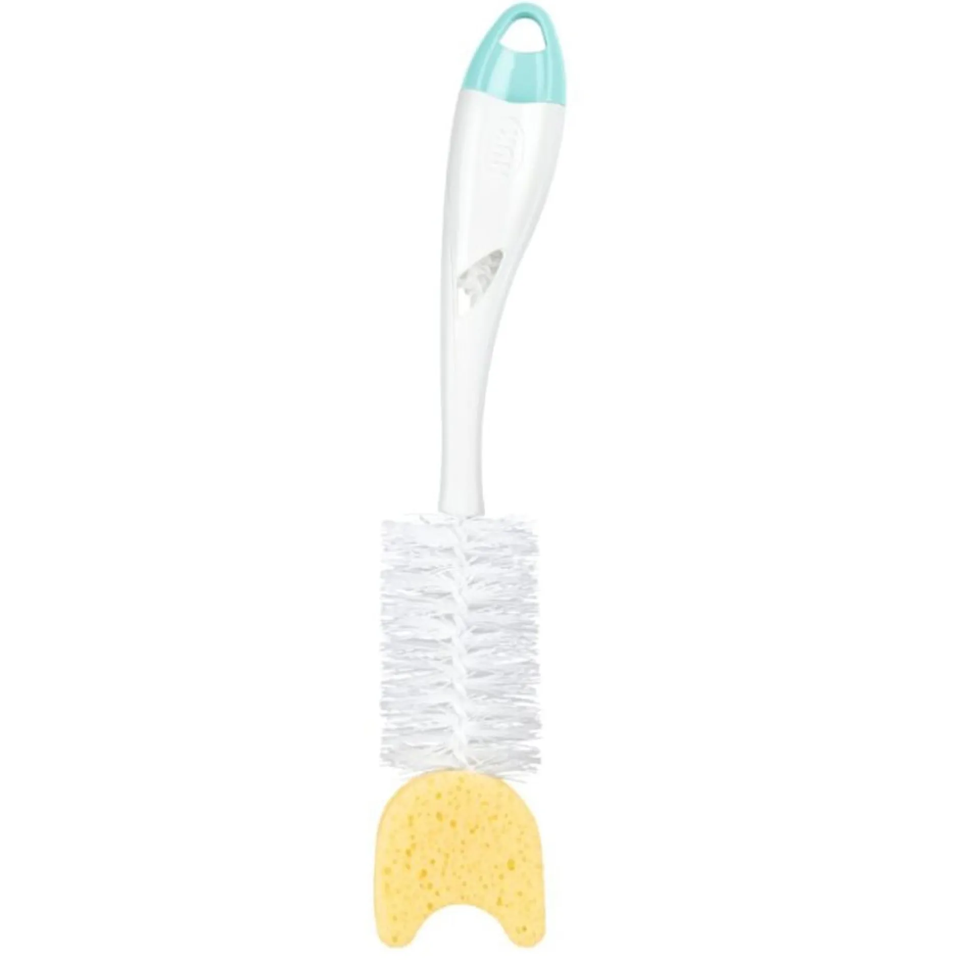 Goupillon avec embout éponge “ 2 en 1 ” NUK efficace : embout en éponge naturelle résistante forme “ tulipe ” pour atteindre tous les recoins du biberon et assurer un nettoyage efficace et en douceur pratique : manche ergonomique rince tétine intégré, s’emboîte parfaitement dans le manche et garde sa forme initiale.
