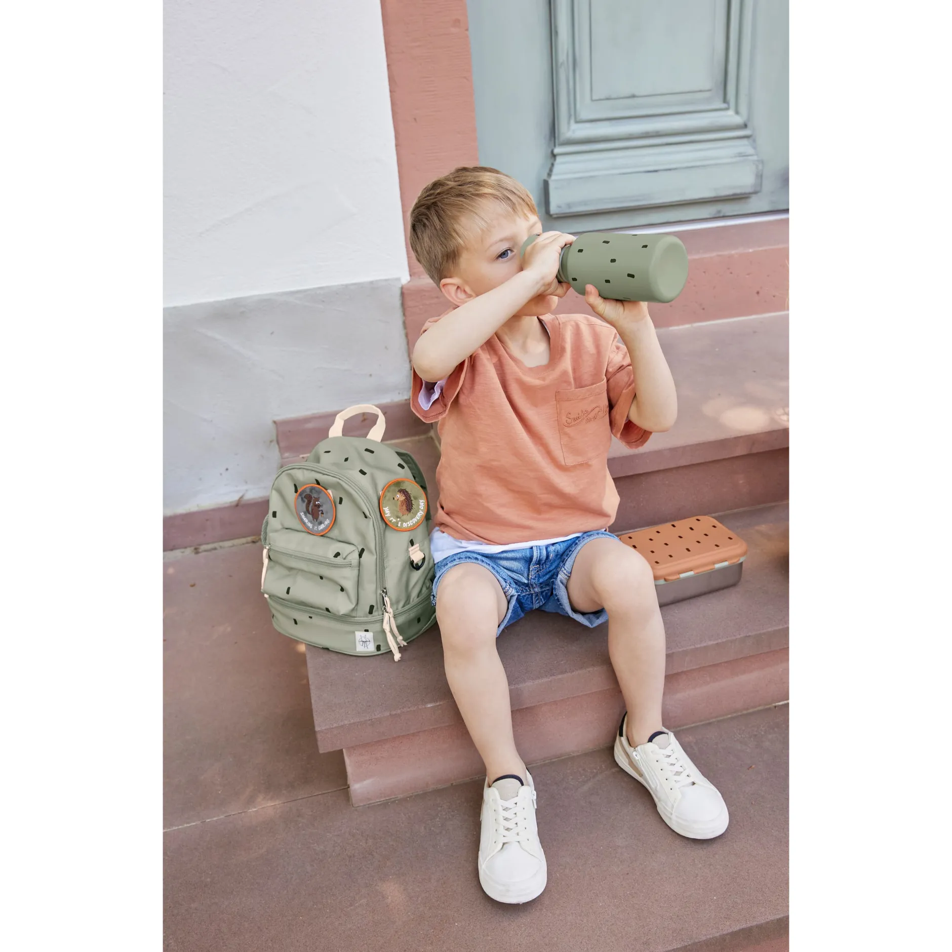 La gourde est dotée d’une large ouverture pour la remplir facilement, et de deux bouchons différents : un bouchon à vis pratique avec une boucle en inox pour porter ou fixer facilement la gourde ; et un bouchon sport qui permet aux enfants plus jeunes de boire tout seuls. La gourde en inox est robuste, sans BPA, et elle ne fuit pas. Elle est parfaitement assortie aux autres produits pour enfants de la collection Happy Prints et sera un accessoire idéal pour le quotidien des petits.