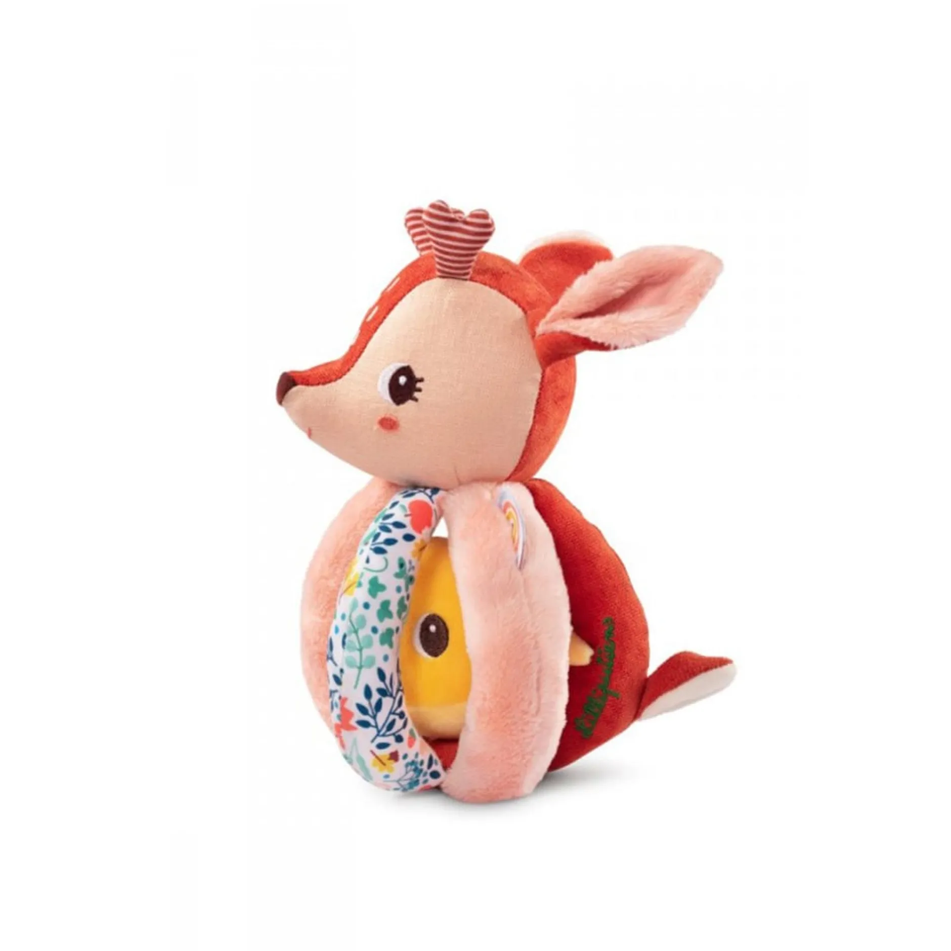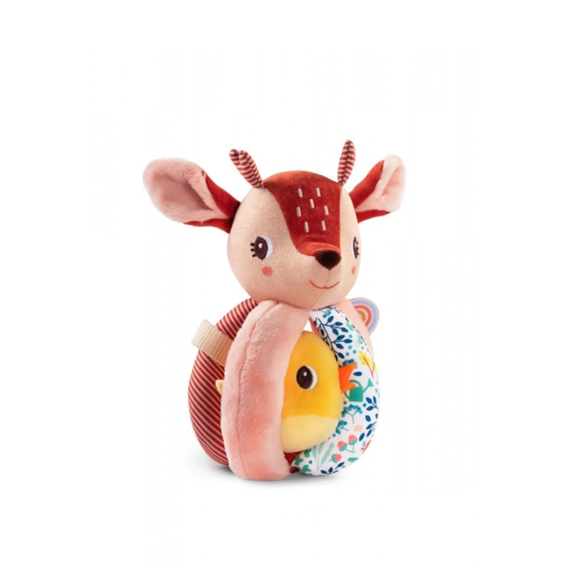 D’abord, un hochet à faire tinter encore et encore dans la tête de Stella le faon, idéal pour éveiller votre tout-petit aux sons. Ensuite, les cinq poignées qui composent le jouet proposent différentes matières et motifs qui stimuleront la vue et le toucher.