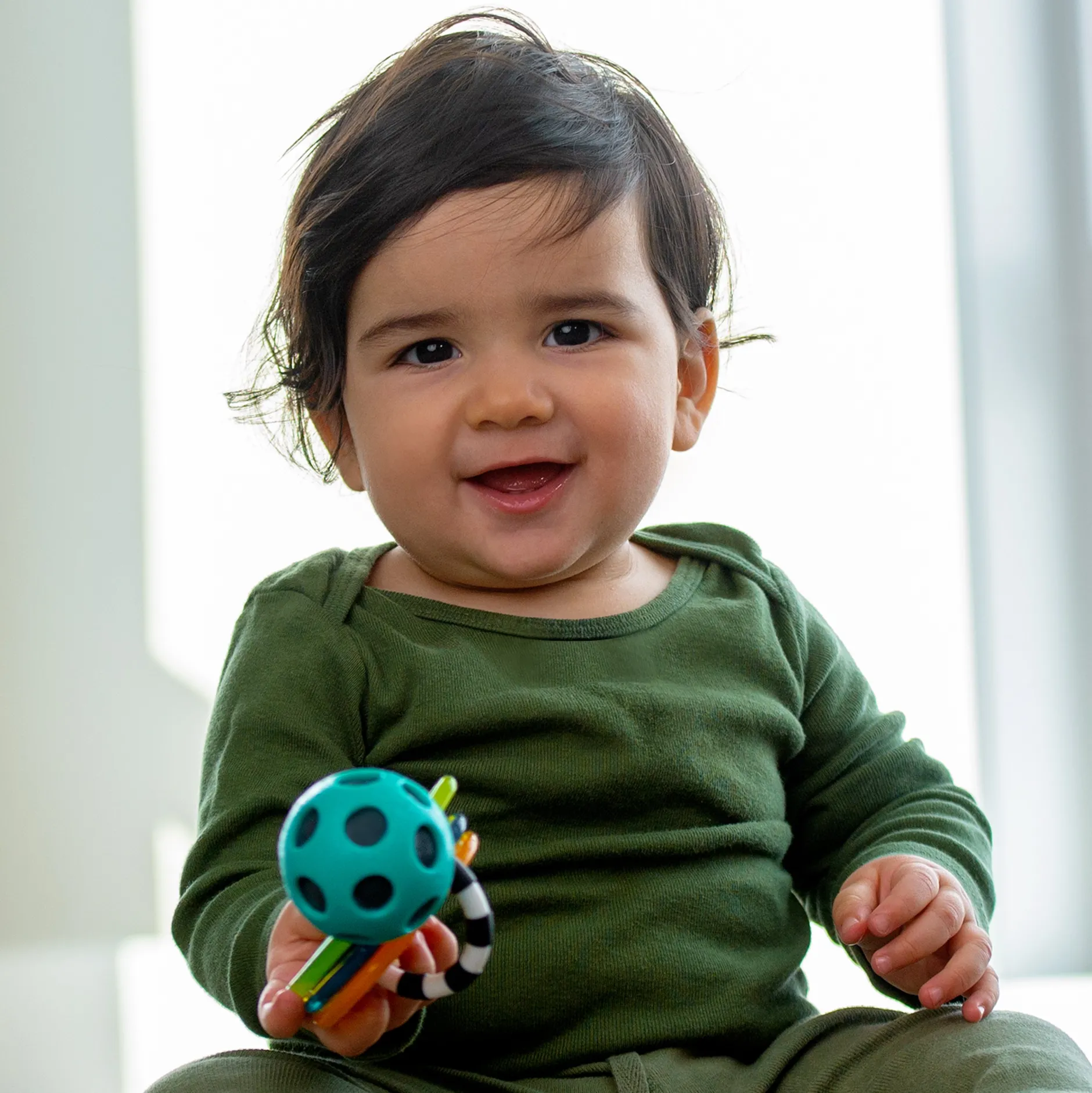 Les clés Drive & Drool placent bébé dans le siège du conducteur ! Une boule à pois cliquetante constitue un porte-clés engageant et offre un son de cliquetis amusant. L’utilisation de couleurs contrastées, de différents matériaux et d’une variété de surfaces aide à stimuler bébé. Le matériau doux et moelleux est parfait pour l’environnement de bébé et va également au lave-vaisselle !