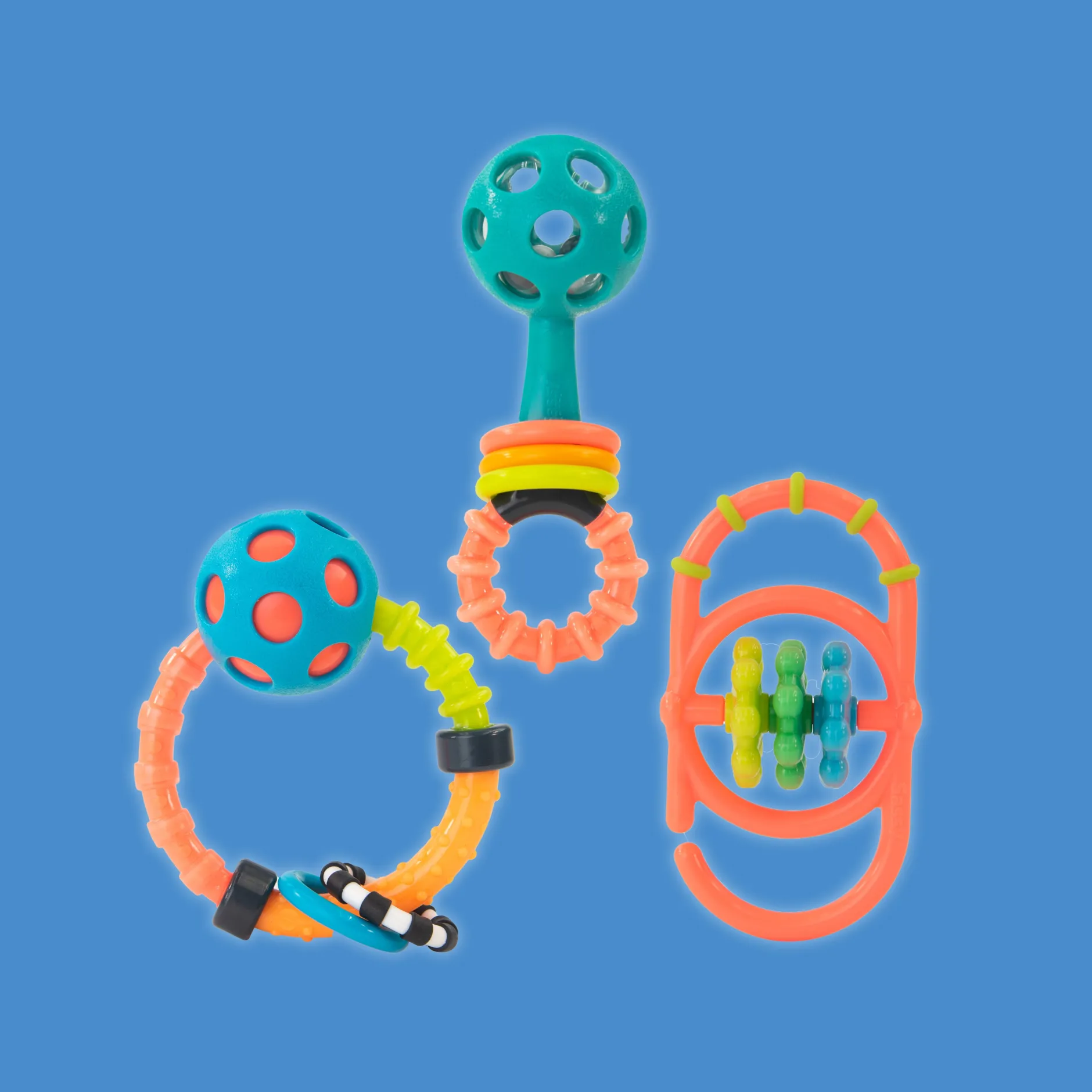 - L’ensemble est livré avec trois jouets : Peek-a-Boo Beads Hochet, Bend & Flex Ring Rattle et le Linky Link