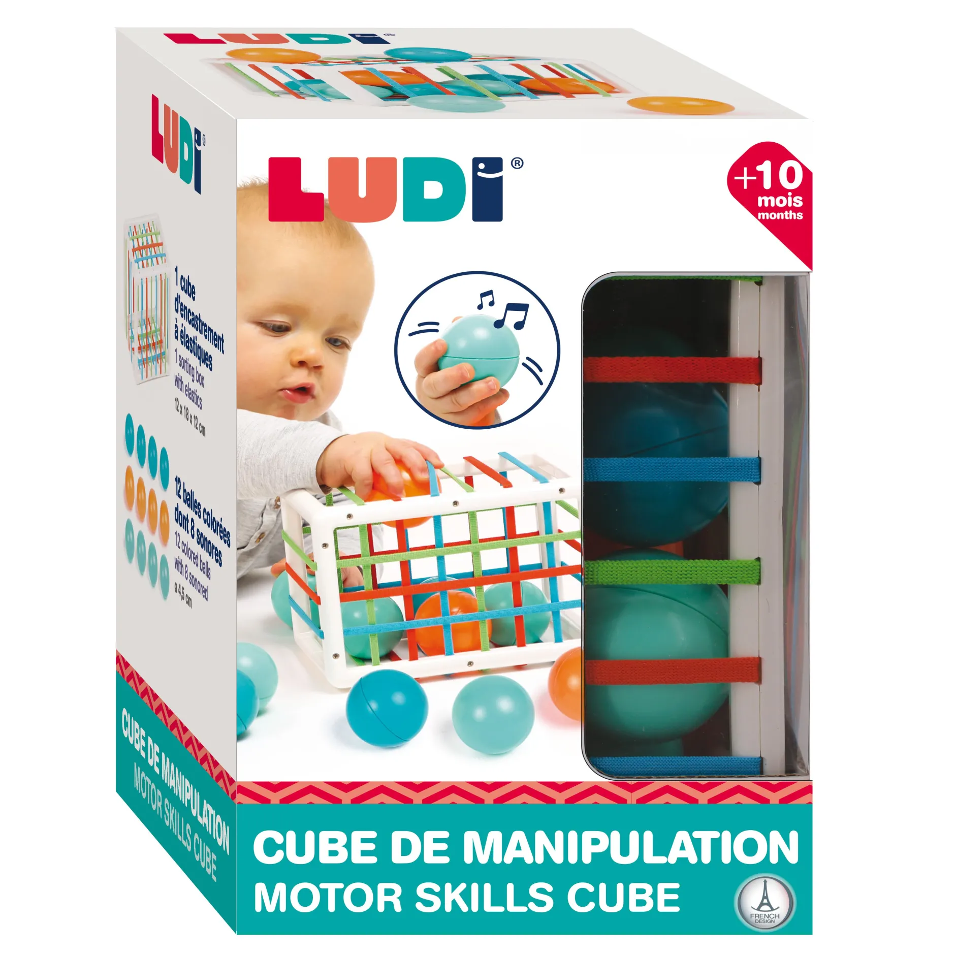 Un cube surprenant avec des élastiques qui enferment 12 balles colorées au son rigolo. Ce jeu d’encastrement original développe la préhension, la logique et la motricité fine. Dès 10 mois.