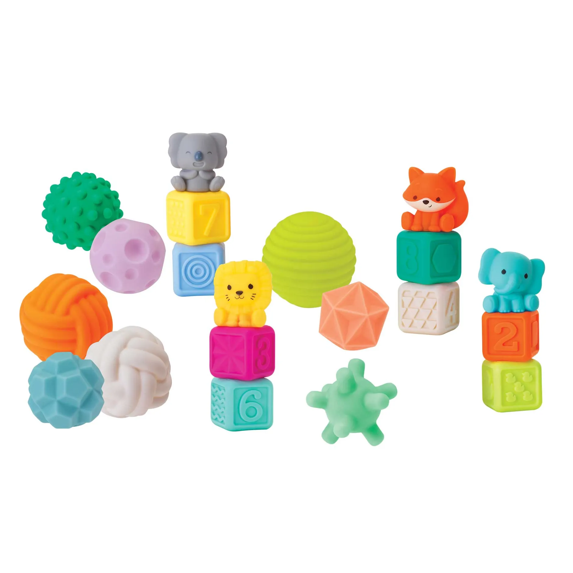 Coffret d’éveil contenant 8 balles de couleurs et formes différentes, 4 animaux et 8 cubes empilables, en plastique très souple.