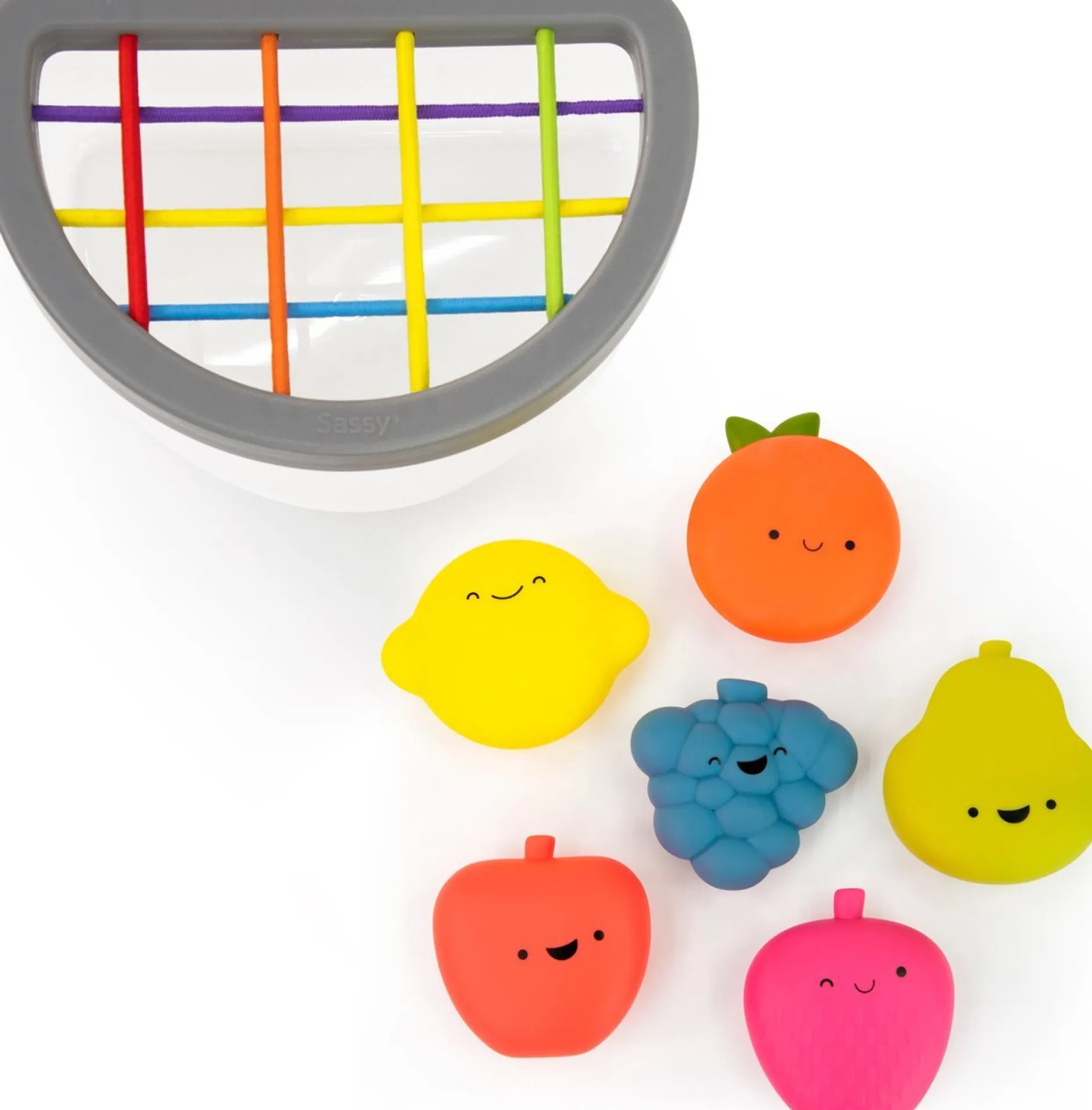 Le Sassy Fruit Fill & Spill contient des fruits texturés, apprend la forme et la couleur de chaque fruit et remplit le récipient pour en renverser le contenu. Remplir et renverser est une activité adaptée au développement permettant à bébé de développer sa motricité fine. Au fur et à mesure que bébé grandit, utilisez le couvercle pour le mettre au défi de pousser les fruits à travers les élastiques. Les fruits eux-mêmes sont texturés et doux pour que bébé puisse les porter en bouche et explorer pour le développement tactile.