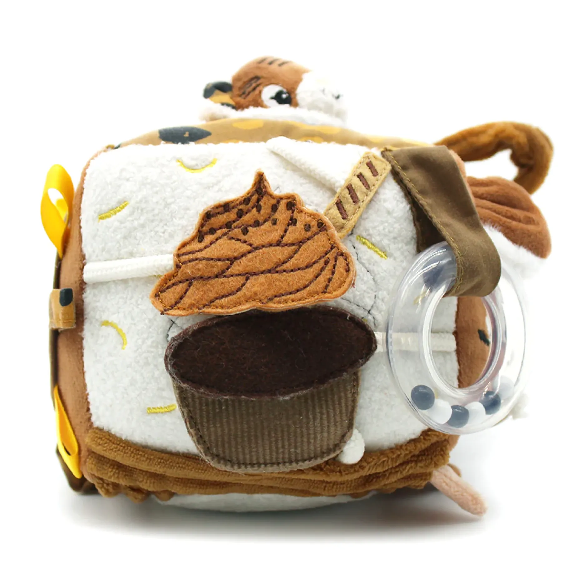 Ce jouet d’éveil marron cassonade et coloré est complet et original. A lancer, mordiller ou secouer, c’est l’éclate assurée ! Le jouet d’éveil bébé est idéal pour éveiller tous ses sens grâce à son miroir, son papier bruissant, son hochet, son anneau de dentition…