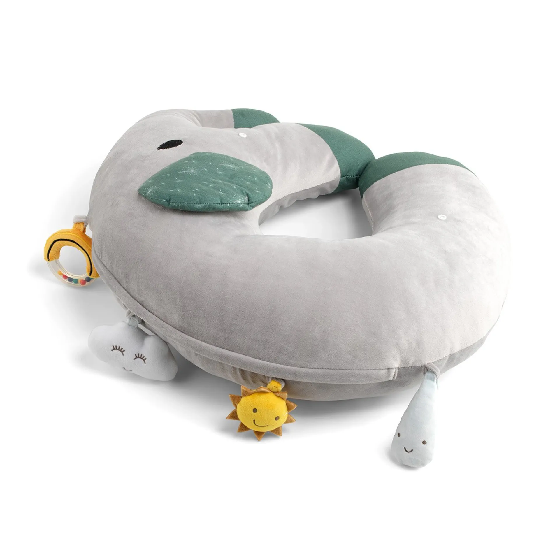 - L’usage de ce coussin est évolutif : la tablette peut facilement être retirée, et les jouets déplacés d’un côté à l’autre du coussin. Bébé pourra alors adopter plusieurs posistions selon son âge et ses besoins.