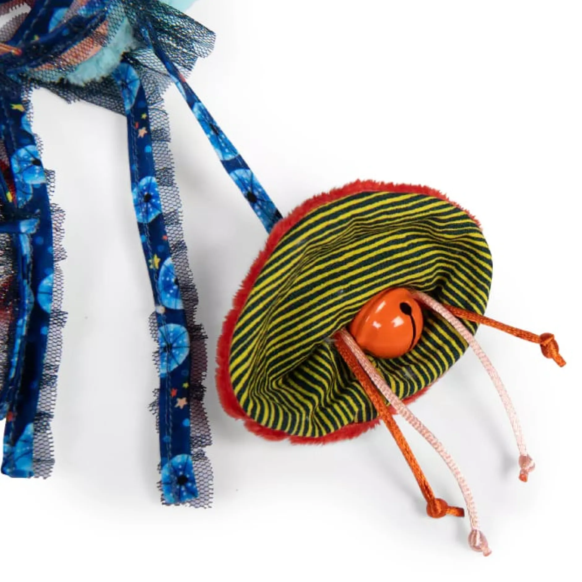 Parmi les algues dansantes, se trouve une jolie méduse aux couleurs irisées qui peut être câlinée ou accrochée. Cette petite créature tendre, aux matières moelleuses est remplie d’activités : prisme, miroir, grelot, dilling et étiquettes à saisir.