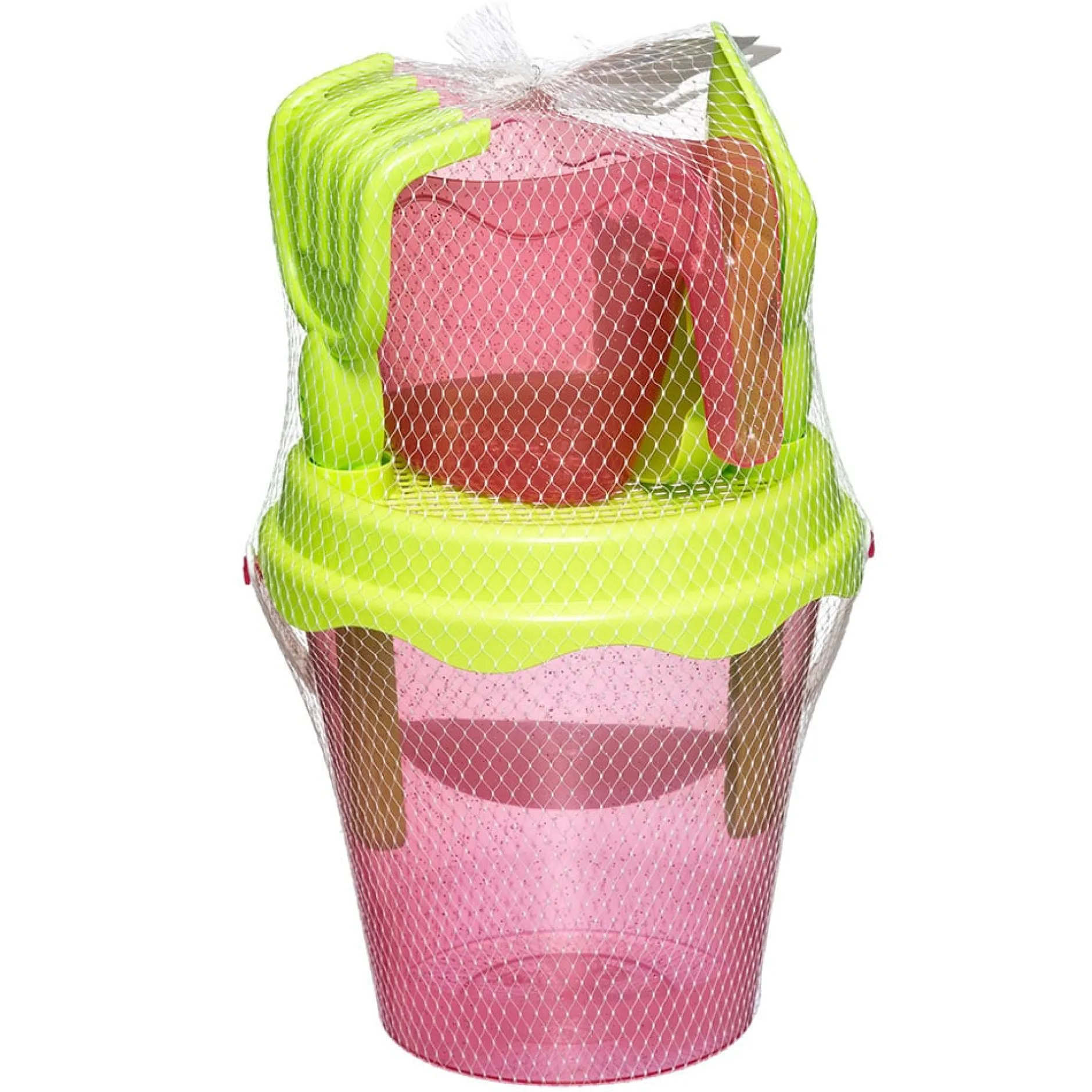 Un seau de plage de 17 cm de diamètre pailleté garni d’un tamis, d’une pelle, d’un râteau, d’un arrosoir et d’un moul…