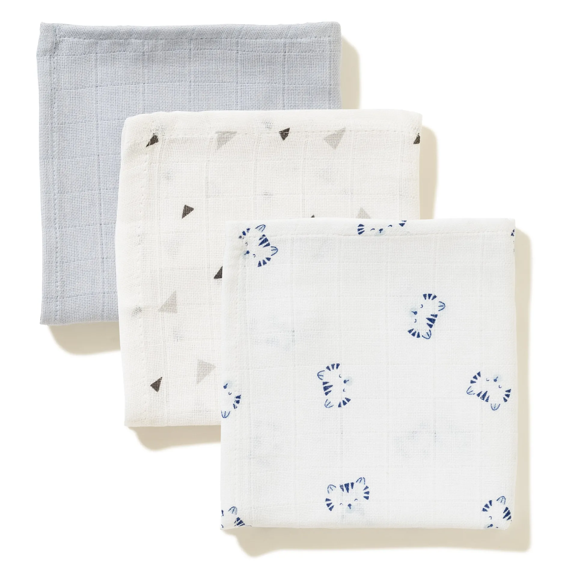 Ce lot de langes parfaitement absorbant est absolument craquant composé d’un bleu ciel uni et d’un imprimé très affectif avec des petites têtes de félins et d’un imprimé mode et géométrique « triangles ».