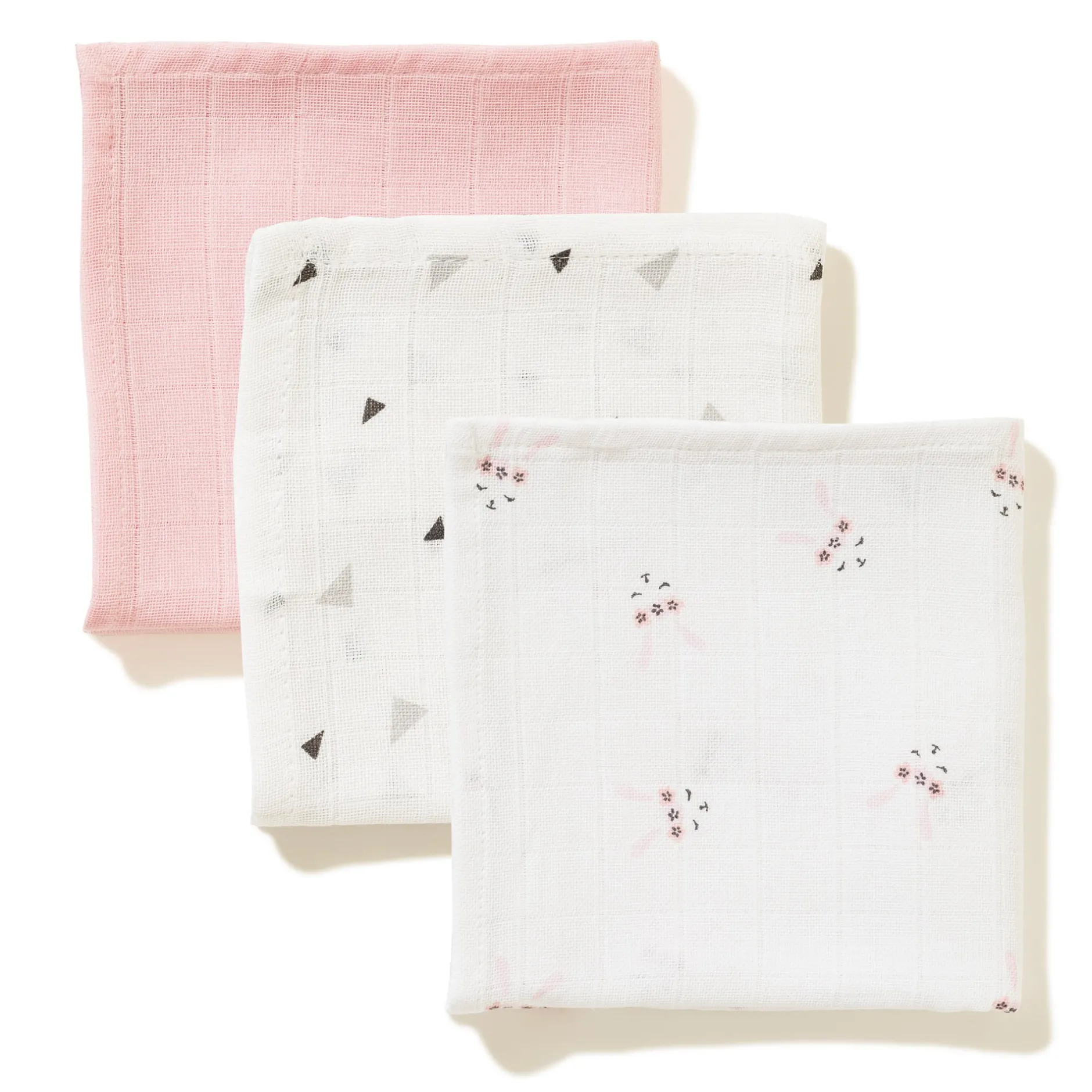 Ce lot de langes parfaitement absorbant est absolument craquant composé d’un bleu ciel uni et d’un imprimé très affectif avec des petites têtes de félins et d’un imprimé mode et géométrique « triangles ».