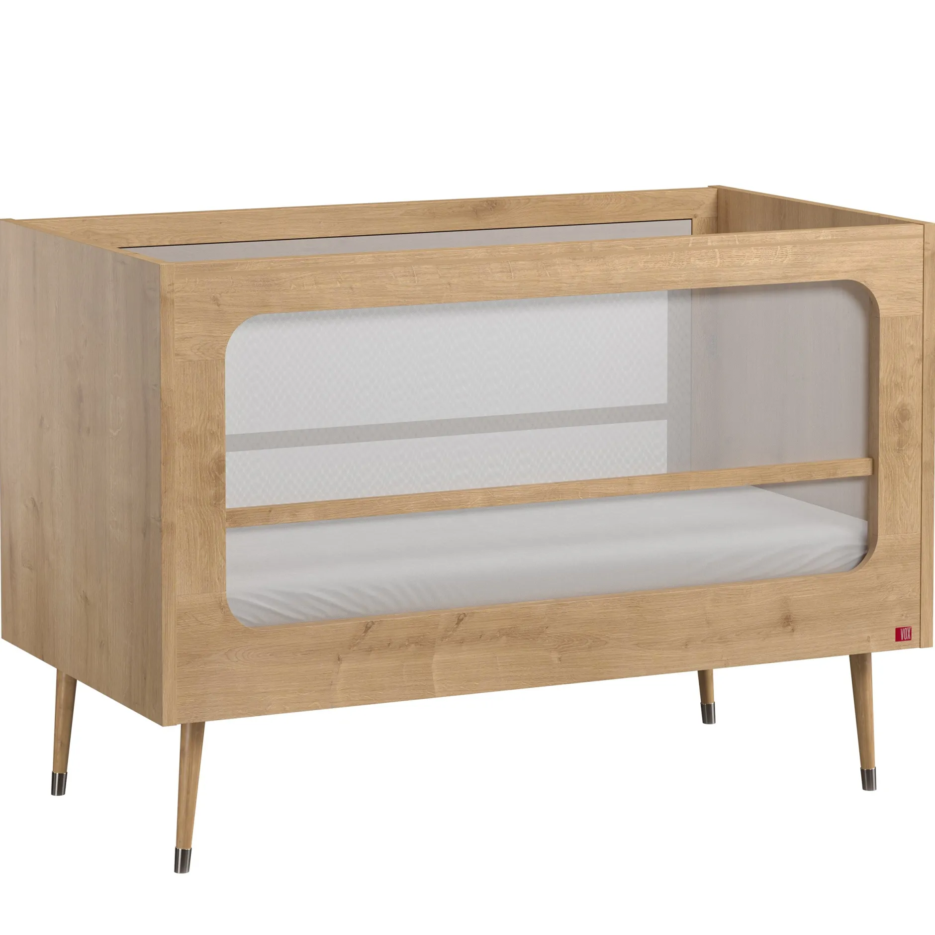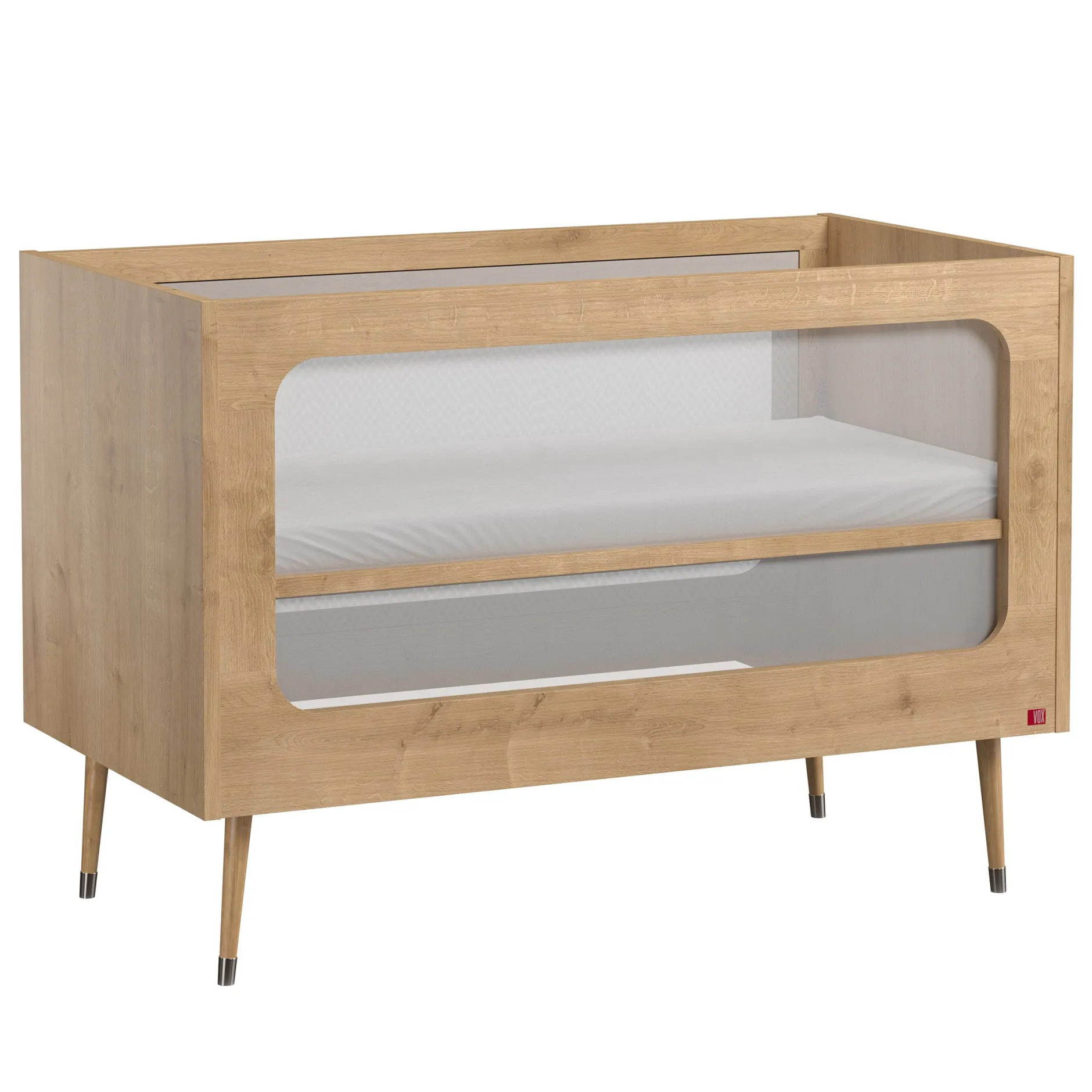Le lit 60×120 avec ses pieds en bois et métal, apportera une touche rétro à la chambre de votre enfant. Idéal pour accueillir votre bébé dans un environnement sécurisé, chaleureux et moderne. Son avantage est le filet transparent au lieu des barreaux. Le tissu laisse passer l’air dans le lit de bébé ce qui permet une bonne aération et offre l’occasion de garder un œil sur bébé. Le lit a deux positions de matelas. Fabriqué en mélamine haute de gamme.