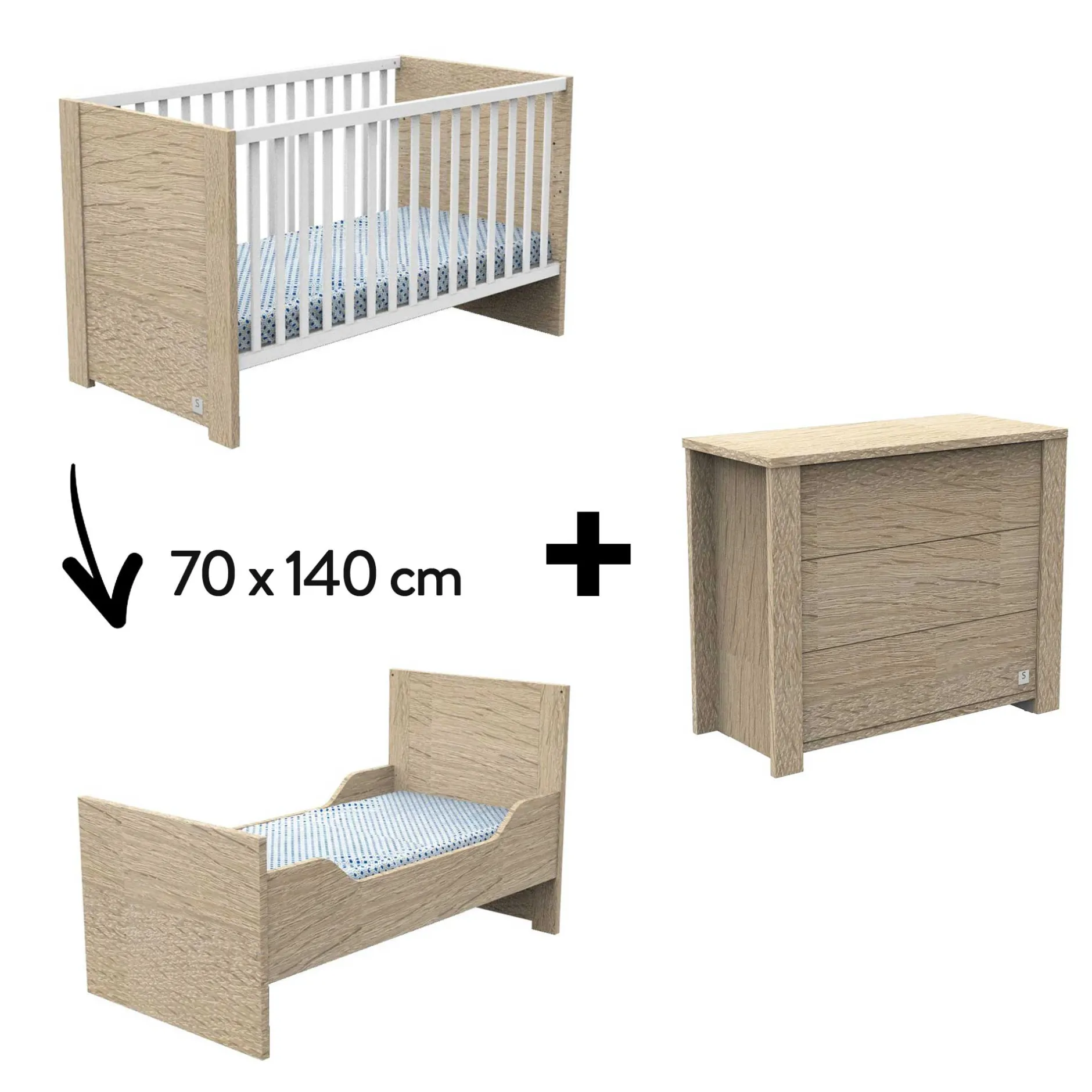 Ce pack contient le lit évolutif 70 x 140 cm (coloris au choix) et une commode (coloris au choix) de la collection Antonin de la marque Sauthon.