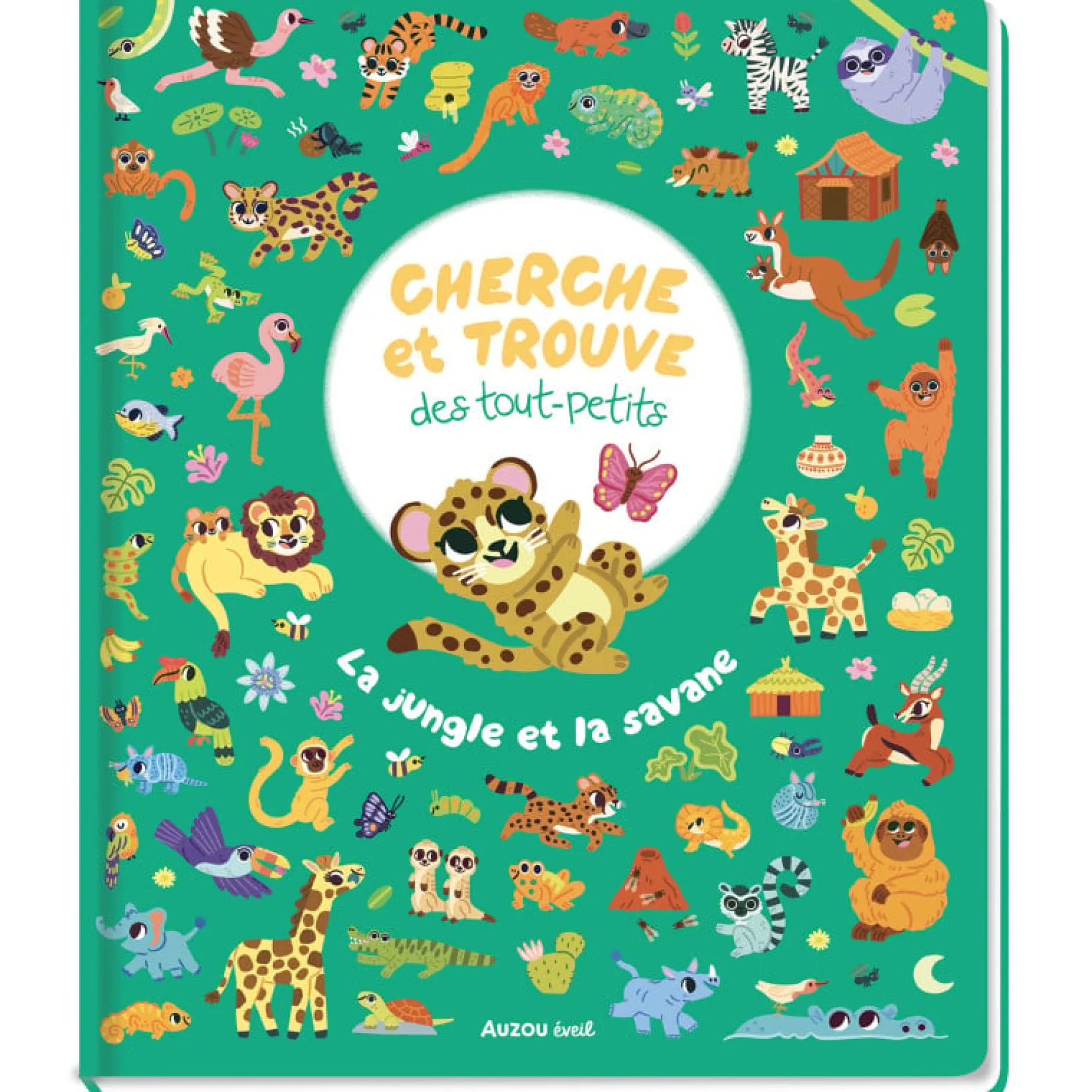 À travers 9 planches foisonnantes de détails, les petits partent à l’exploration de la jungle et de la savane. Ils observent attentivement et retrouvent 7 éléments (+ la mascotte) bien cachés sur chaque planche.
