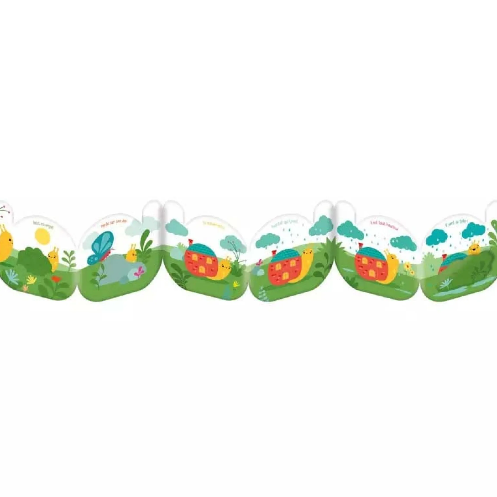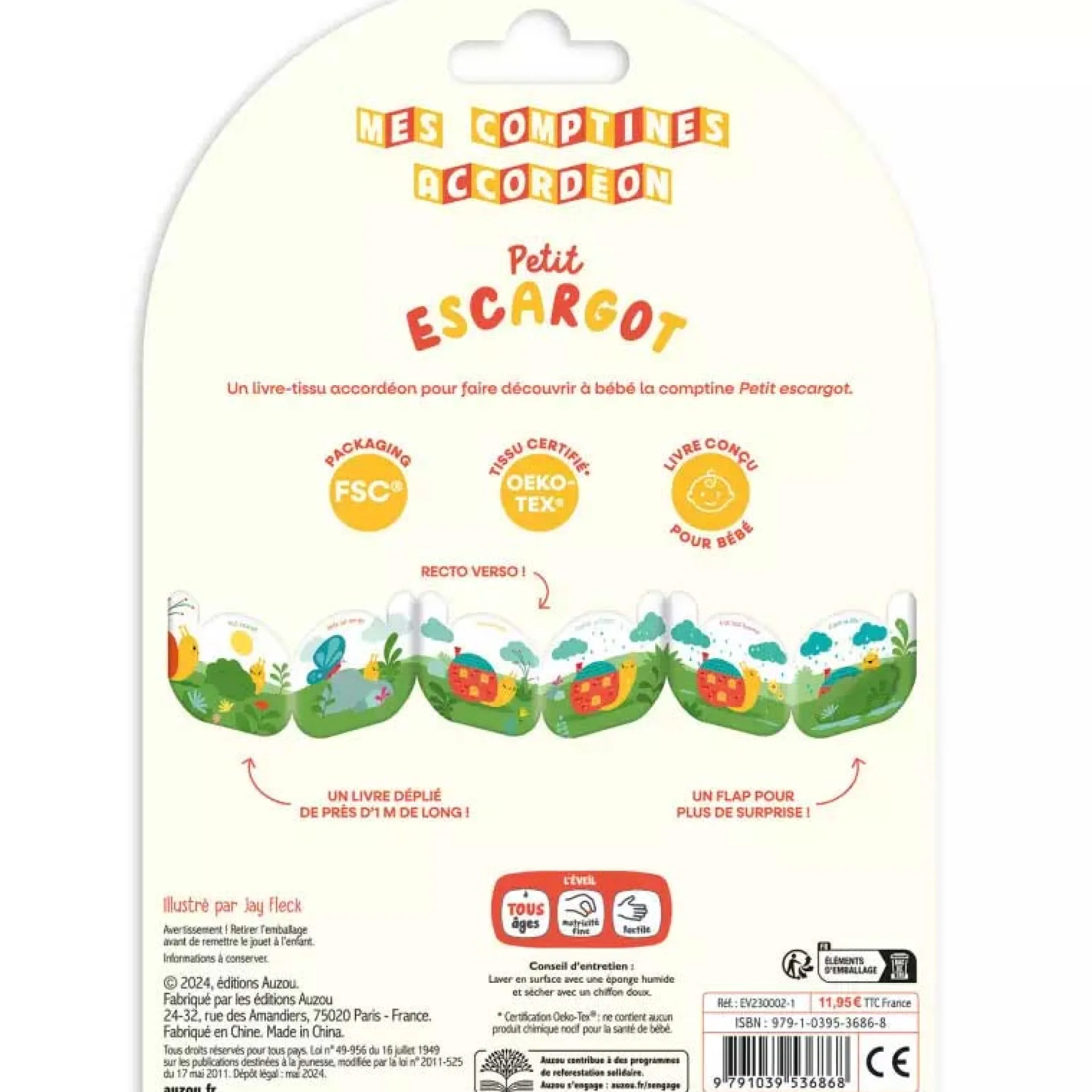 Un joli livre tissu-accordéon autour de la comptine « Petit escargot », conçu pour bébé, avec un tissu certifié Oeko-Tex® et un flap pour plus de surprise !