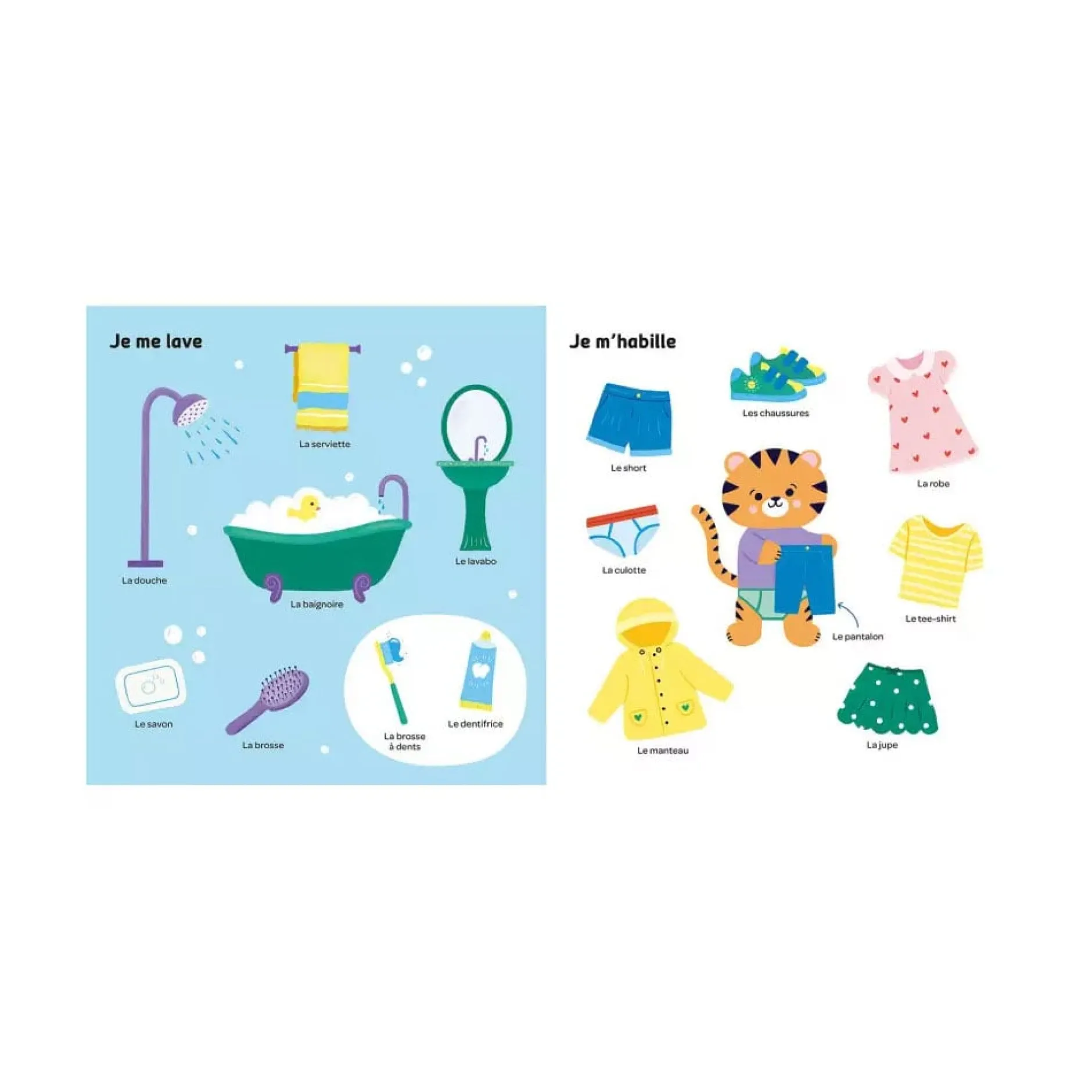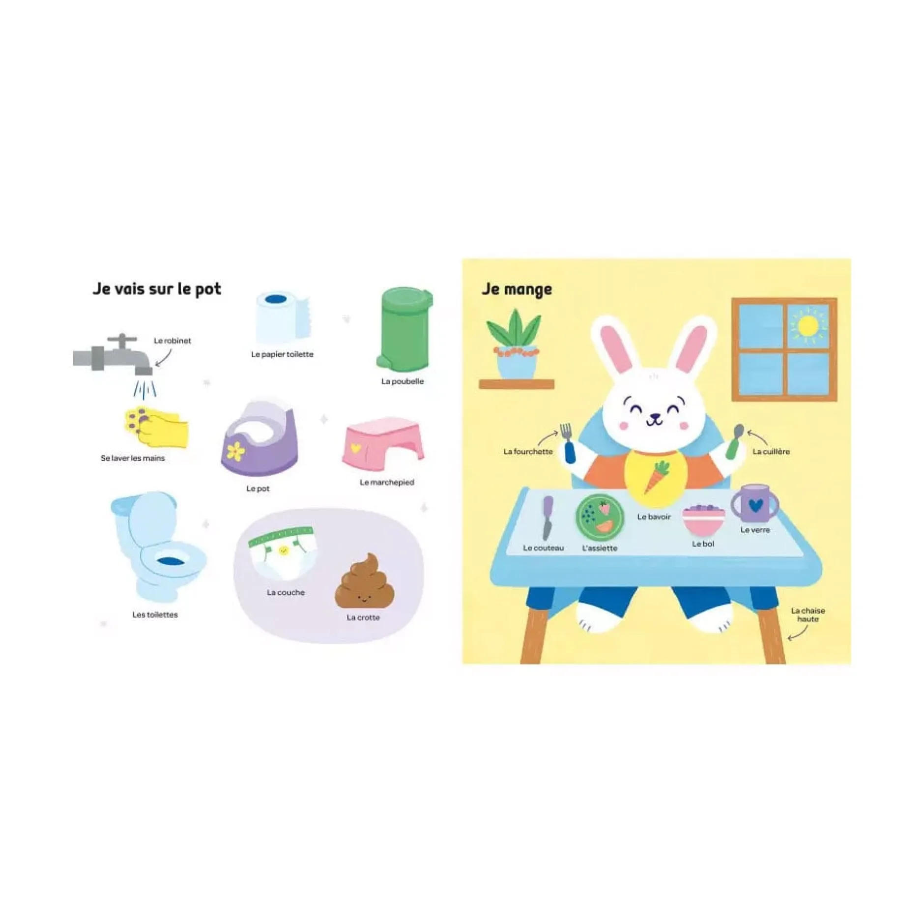L’imagier est un incontournable dans les premières lectures de bébé : cela permet de montrer, nommer et reconnaître les éléments de leur quotidien. 12 univers pour bien grandir : Je mange Je vais sur le pot Je me lave Je m’habille Je construis Je crée J’apprends Je joue Je range Je bouge Je rêve Je dors
