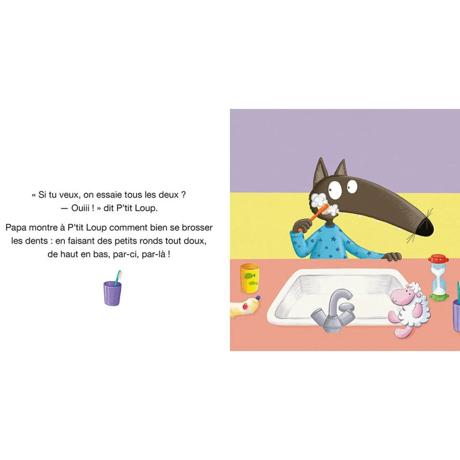 Tous les soirs, c’est la même chose, P’tit Loup n’a pas envie de se brosser les dents. Pour l’aider, Maman lui présente Quenotte : un drôle de sablier. On le retourne et on frotte, on frotte ! Lorsque le sable est entièrement écoulé, ça veut dire que P’tit Loup peut se rincer les dents. En plus, Papa a acheté un dentifrice à la fraise, le parfum préféré de P’tit Loup. Se brosser les dents n’aura jamais été aussi amusant !