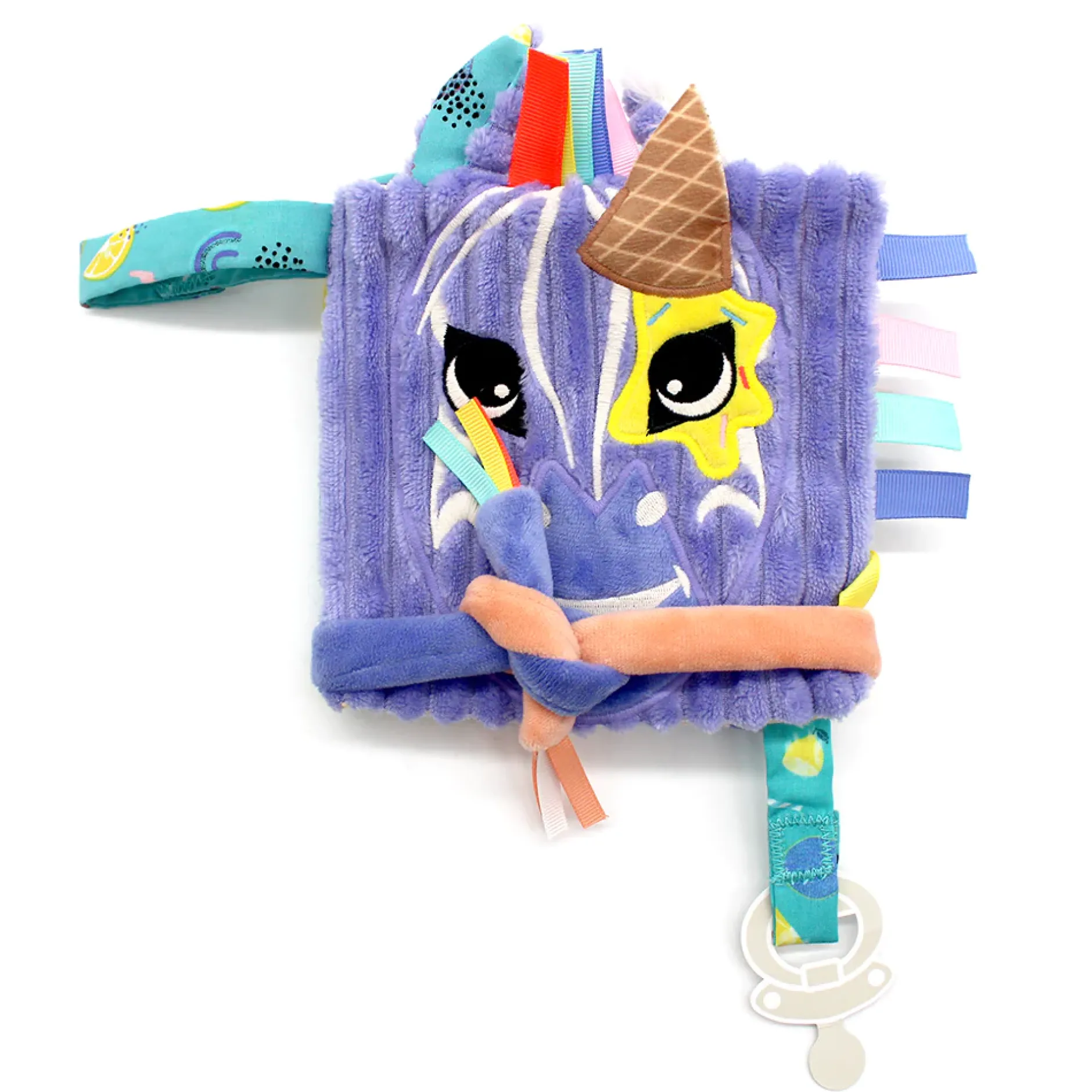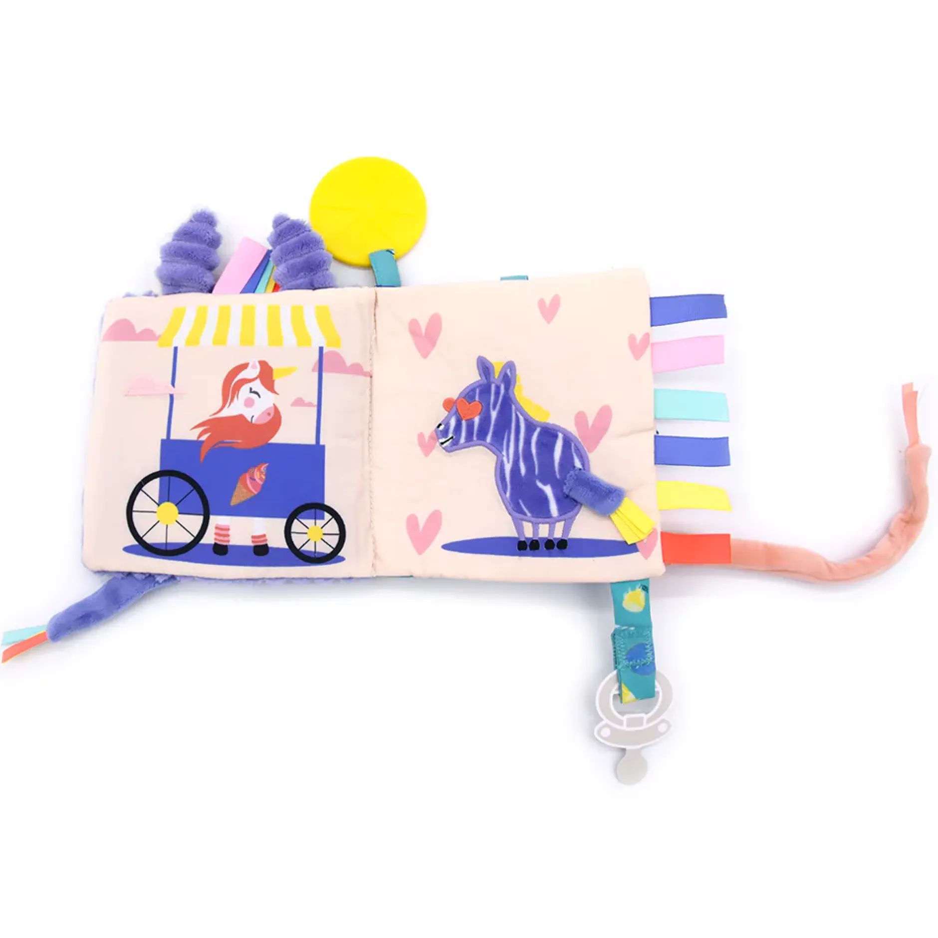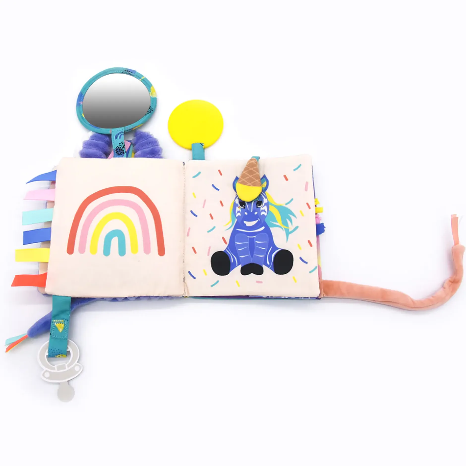 Une petite photo peut être glissée au dos du livre d’éveil grâce à sa pochette plastifiée. En velours côtelé et soft violet et coloré, le livre d’éveil est très agréable au toucher pour bébé. Son petit plus : ses 2 attaches ! L’une pour la sucette de bébé pour ne pas la perdre en voyage et l’autre pour attacher le livre d’éveil dans un parc, une arche, une poussette,…