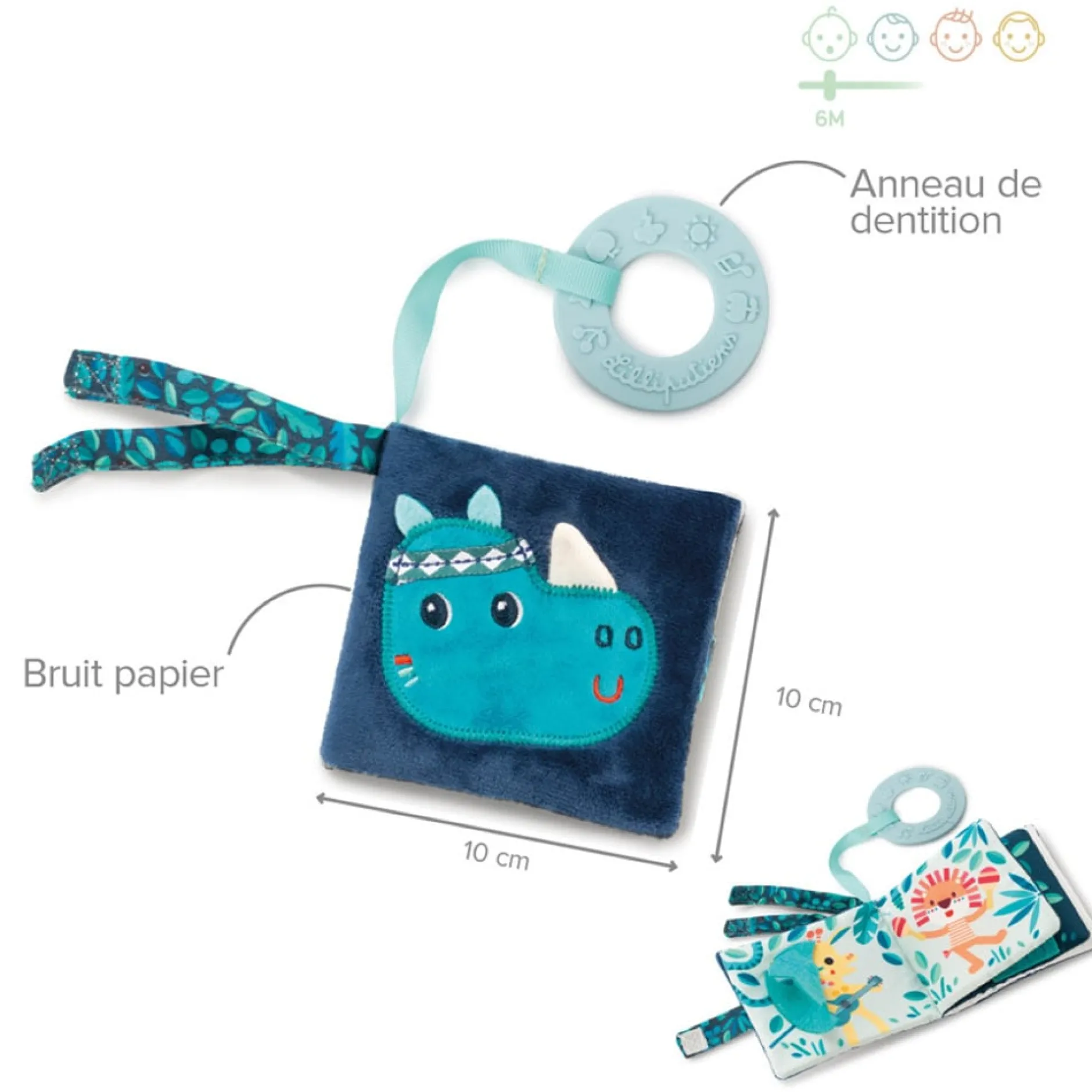 Et pour attiser la curiosité de bébé et favoriser son éveil aux sons, la couverture du livre contient du papier bruissant à faire crépiter.