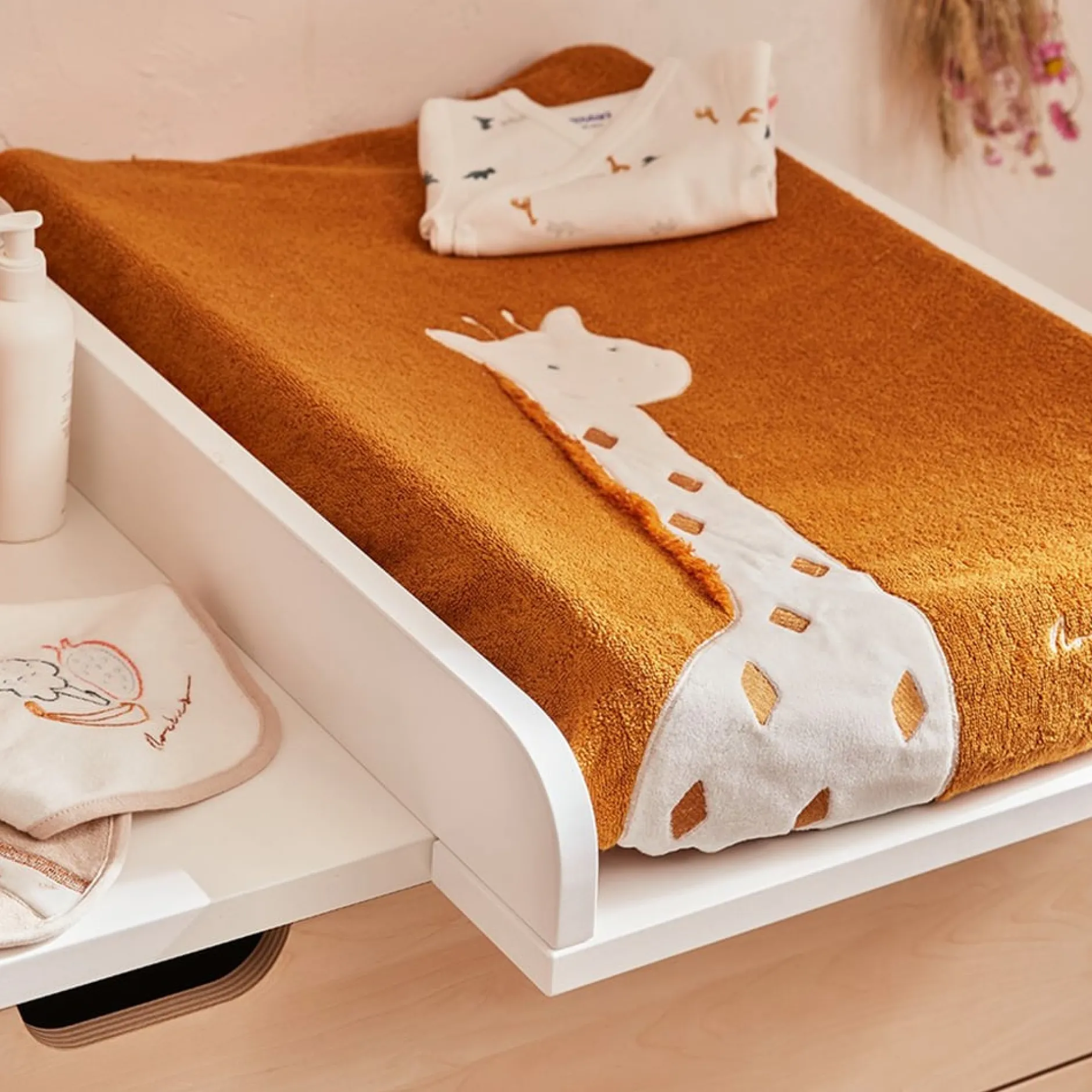 Le matelas à langer ocre de la collection Tiga, Stegi & Ops en matière bien absorbante rebrodée de Tiga la girafe est pleinement adapté à la morphologie de bébé, ce qui lui assure un confort optimal.