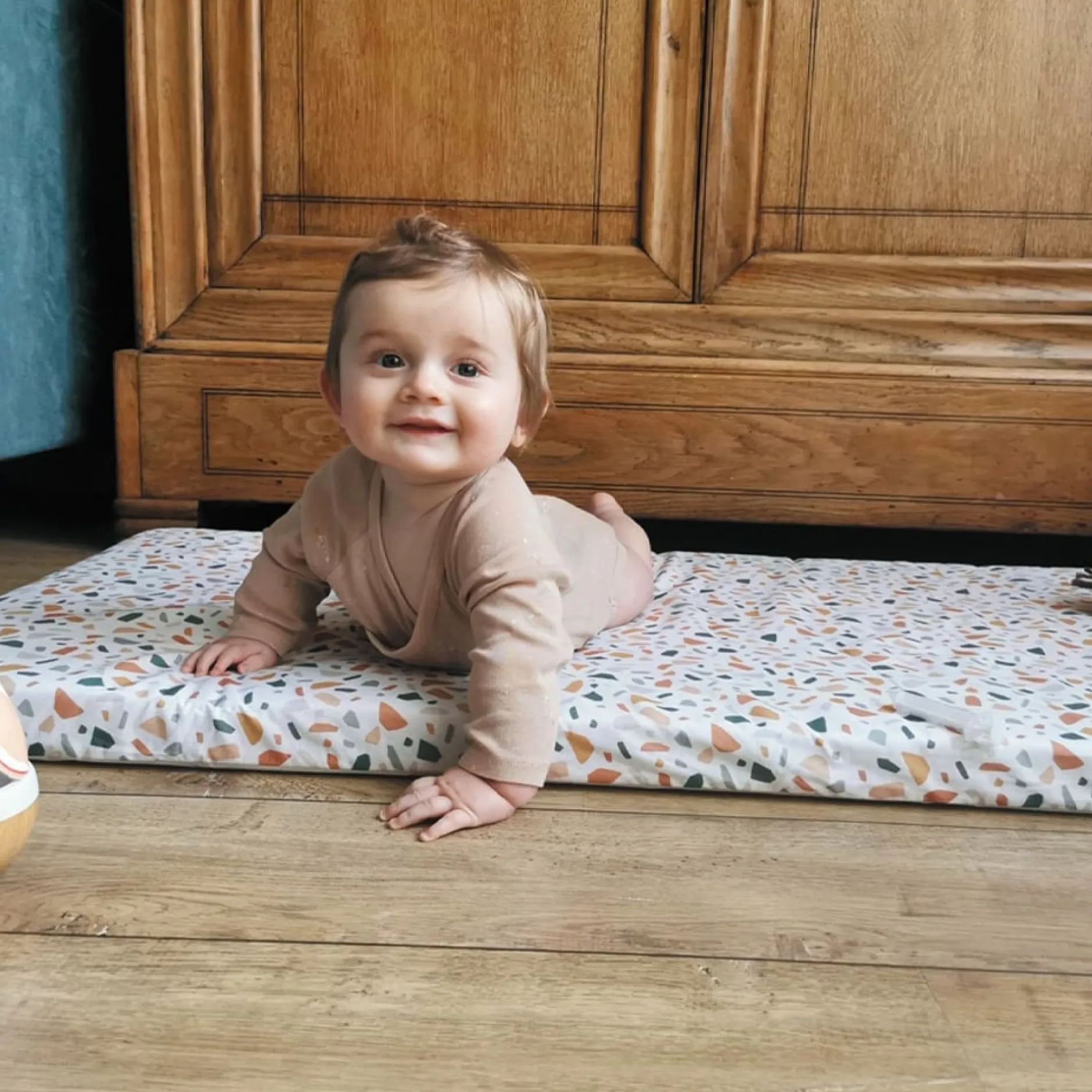 - Posez-le à l’extérieur : Positionné au sol, vous pouvez l’utiliser comme un tapis de jeu pour bébé. Le dessous PVC vous permet de le garder au sec et de le nettoyer en un tour de main. Le PVC a l’avantage de faire barrière entre le froid du sol et bébé.