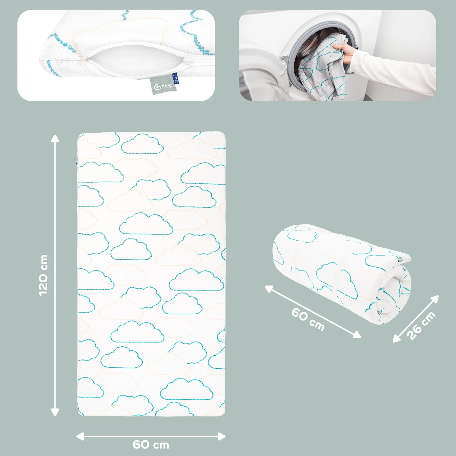 Ce matelas est composé d’une mousse polyuréthane d’une densité de 23kg/m3 pour un soutien optimal. Sa housse toute douce et molletonée est parfaitement adaptée à la peau sensible de votre bébé. Ce matelas d’appoint de 120 x 60 cm est un matelas de taille universelle. Il est parfaitement adapté à tous les lits parapluie ou à barreaux de la même dimension.