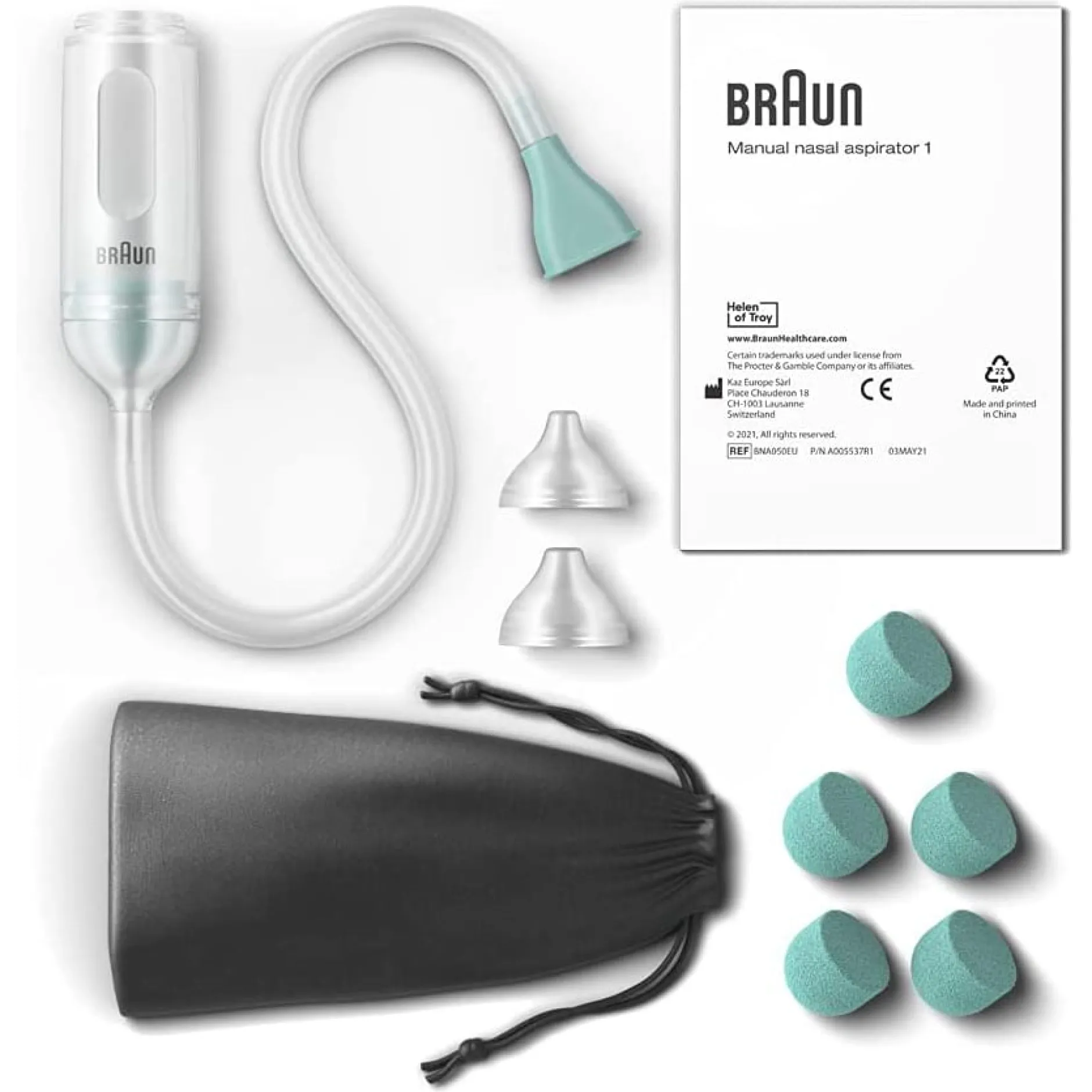Deux embouts pour une utilisation confortable à tout âge (+0 mois)Puissance d’aspiration constante contrôléeGrands filtres jetables robustes qui absorbent la boueFacile à nettoyer – pièces amovibles faciles à nettoyer et lavables au lave-vaisselle. * À l’exception du tuyau, utilisez de l’eau bouillante pour laver le tuyau.Sûr, hygiénique et confortable pour les enfants et les parentsL’aspirateur nasal manuel Braun 1 aide à libérer les nez bouchés rapidement et en douceur, avec une aspiration contrôlée et constante et deux embouts nasaux au choix. Cela rend cette tétine facile à utiliser et adaptée aux tout-petits à partir de 0 moisDIMENSIONSlongueur 50cmvaste 8cmprofondeur 4 cmpoids 30gMATÉRIELMatériel PlastiqueCONSEILSGarantie constructeur 2 ansétendue de la livraison Stockage sacpièces jointesinstructions brèves pour une utilisationInstructions d’entretien lave-vaissellenettoyage facileLangues Notice d’utilisation / de montage Allemand (DE)Anglais (EN)Français (FR)Néerlandais (NL)Danois (DA)